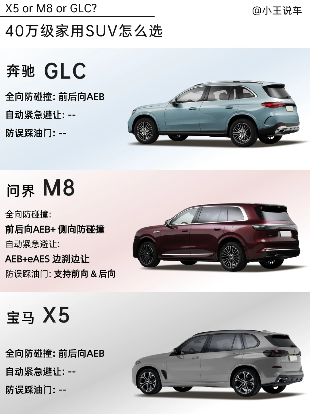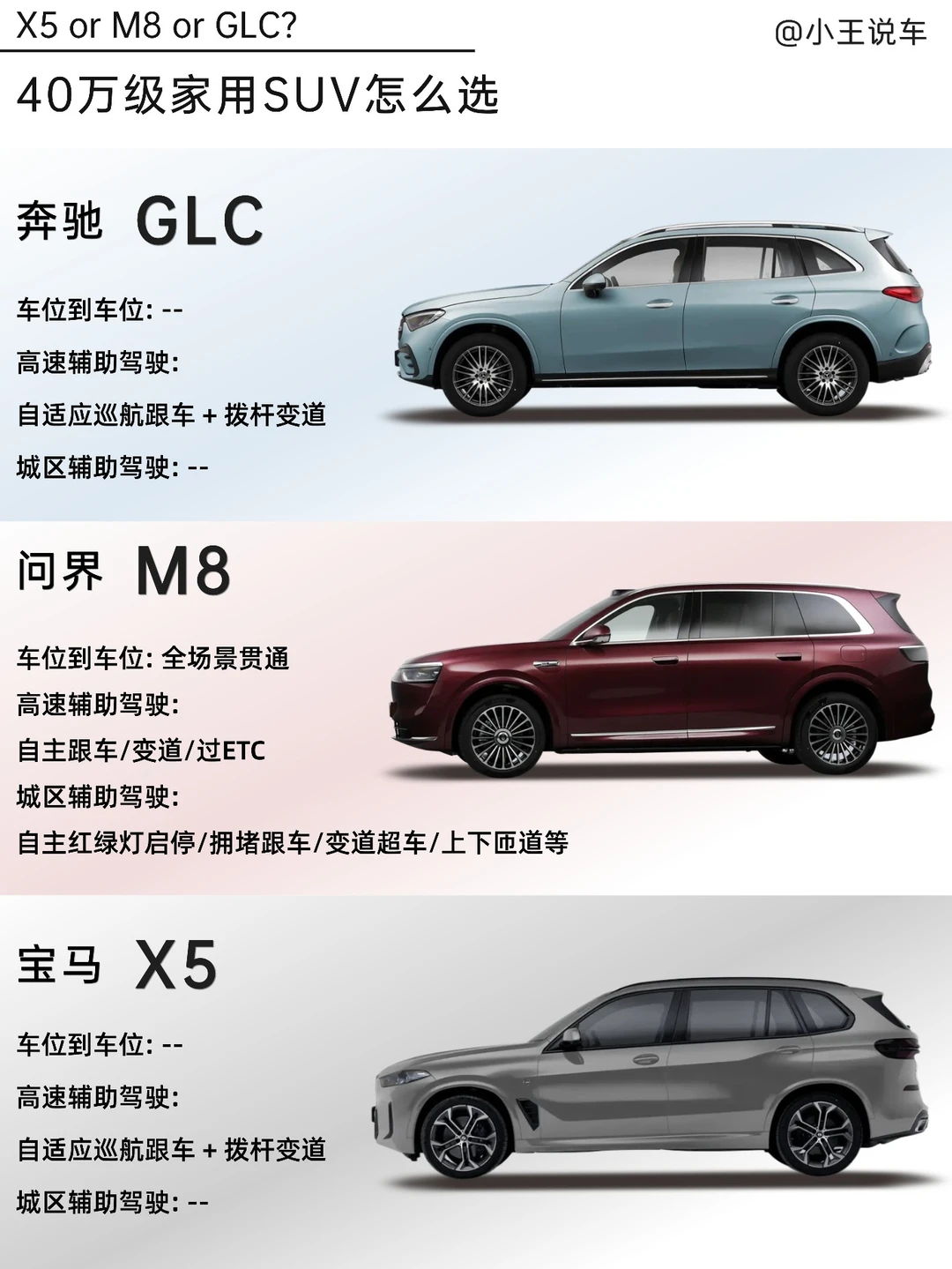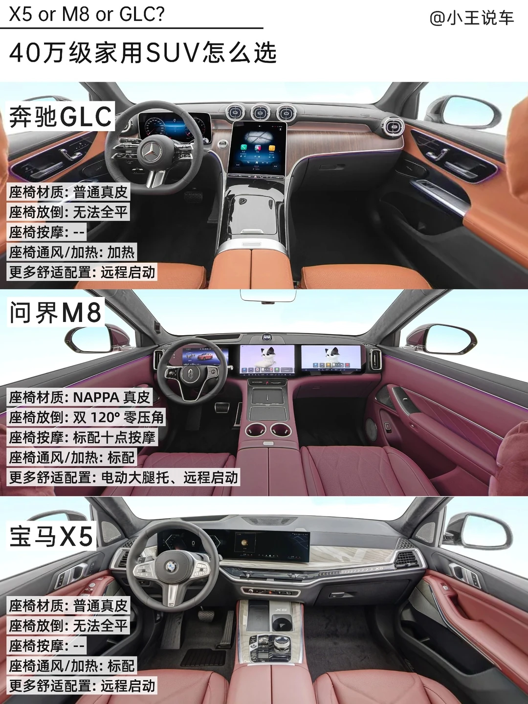 40万选家用SUV,很多人会纠结老派豪华BBA还是科技新秀问界M8,百年品牌宝马X5、奔驰GLC,👀或智能实用问界M8,其实市场销量已经给出答案,问界M8的豪华质感出色,底盘操控BBA有的配置M8也有,甚至更加出彩;🔸而智能驾驶、百万像素投影大灯这些M8更是直接拉满