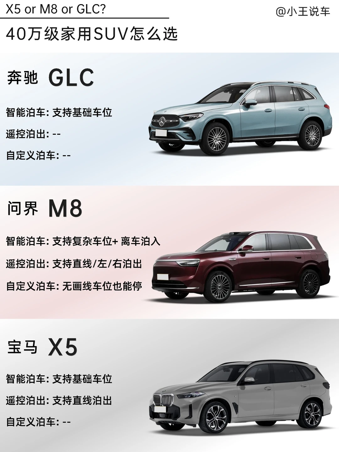 🎈宝马X5和奔驰GLC拥有基础泊车能力,但没有激光雷达,只能识别宽大车位,复杂场景需要人工接管泊车