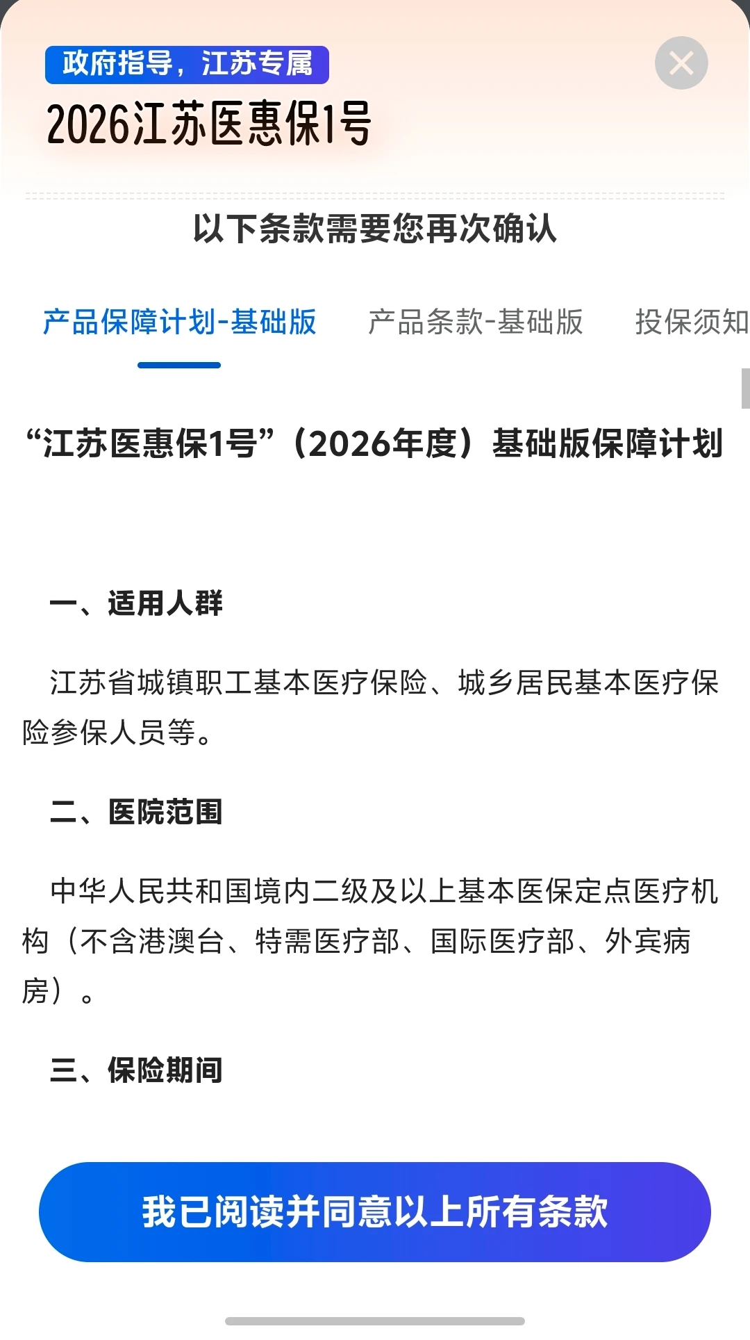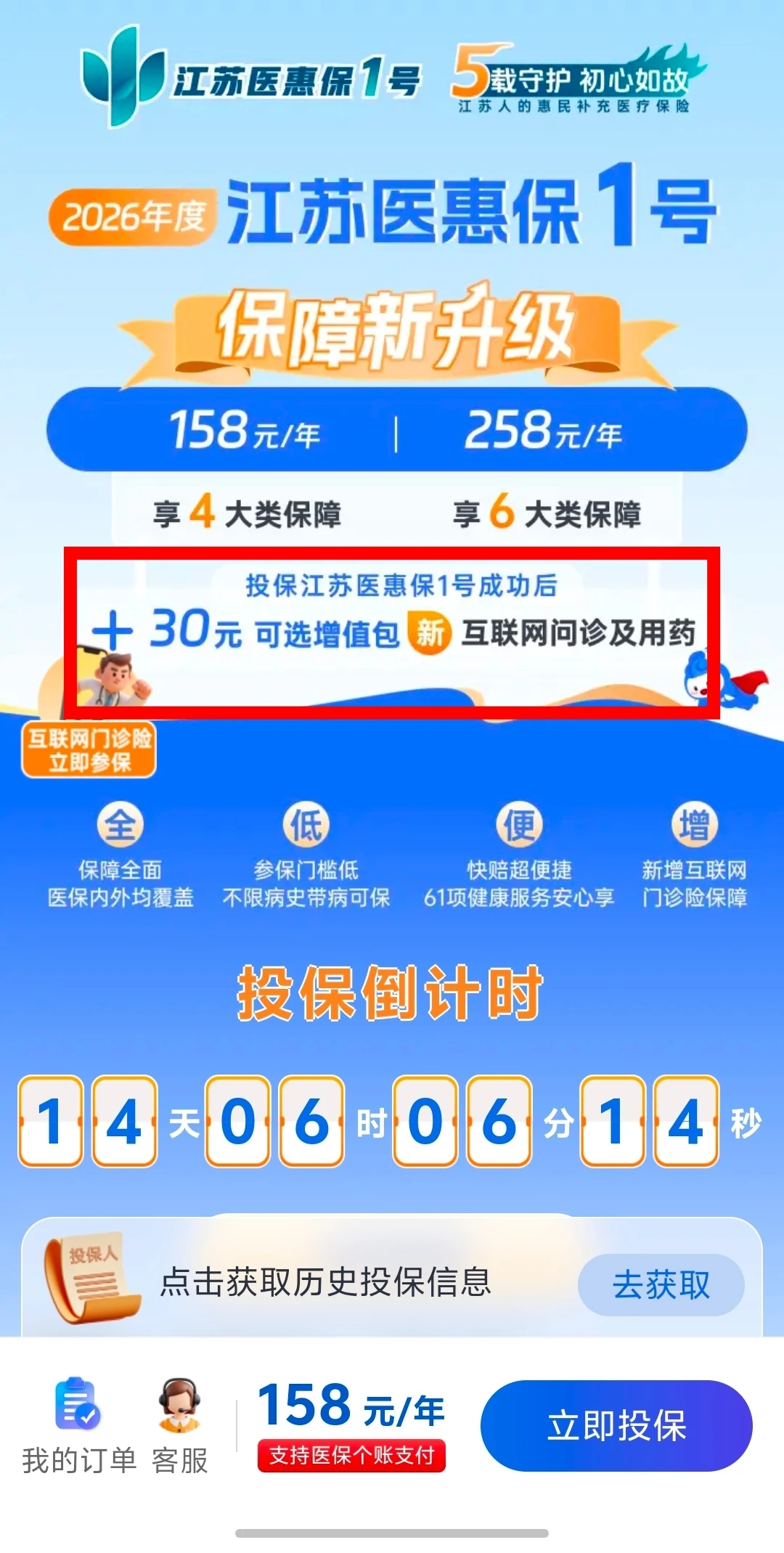 昨天还在小区业主群里刷到提醒,我们本地人专属的江苏医惠保1号参保快截止了,只剩下不到两周的时间,错过还得等下一年,于是赶紧给全家人续上!