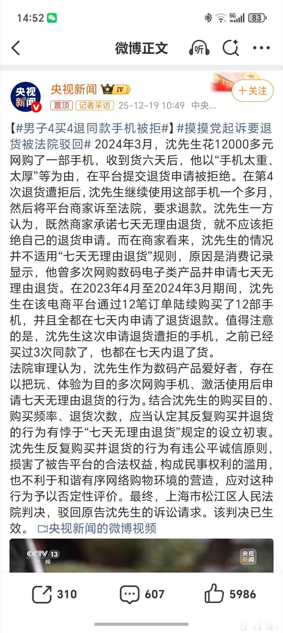 男子4买4退同款手机被拒这不会是开箱数码博主吧估计就是那些专门拍开箱视频的数码博