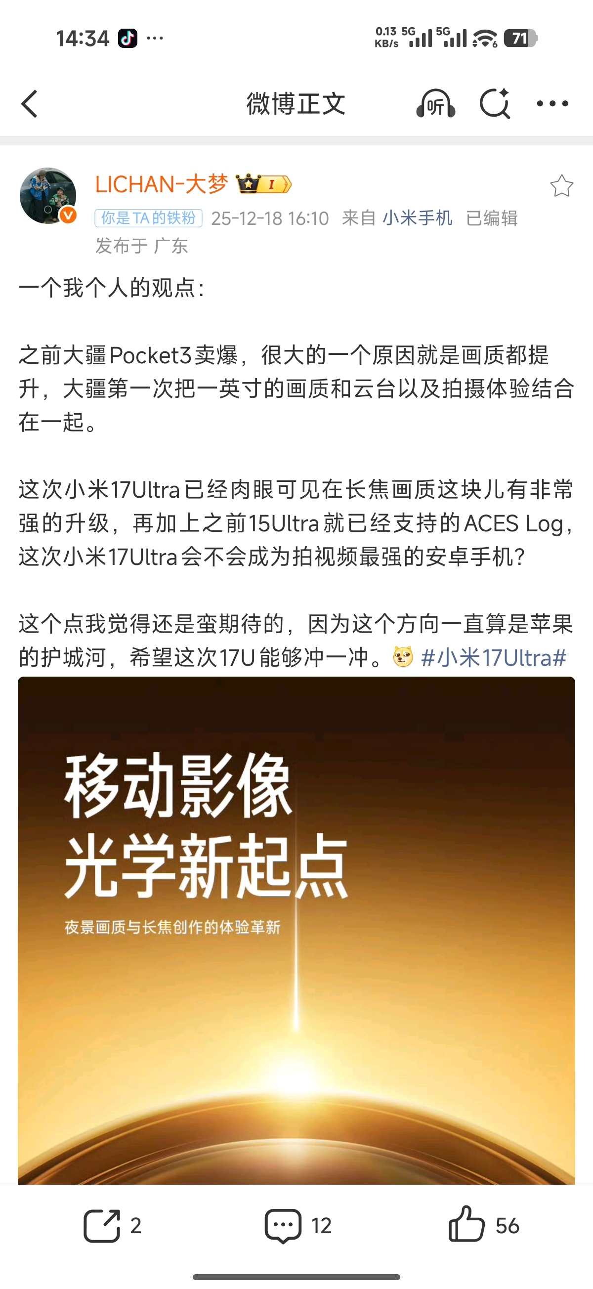 pocket3和iPhone都证明了一件事情,做好动态视频拍摄真的很重要,拍照叠加ai,粗看基本不会有太大差距,但是视频差距那就太大了小米17u这次视频拍摄提升巨大,就是不知道比起iPhone17pm能有多大差距。希望提升程度能到让我把pocket3给大家抽了的水平