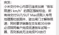 编个20kph我都能半信半疑去求证,5kph还是算了,比步行还慢,已经严重影响交车了。还倒车试驾一圈,神经病说起来,米车维修模式倒是限速40还是30来着想不起来了,之前yu7刮了一下,补漆之后开出来,晚上九点多售后可能困糊涂了,没解锁回用户模式,我直接开维修模式上路之后一脚电门发现车不怎么走,赶快回售后让他们解锁换成用户模式。