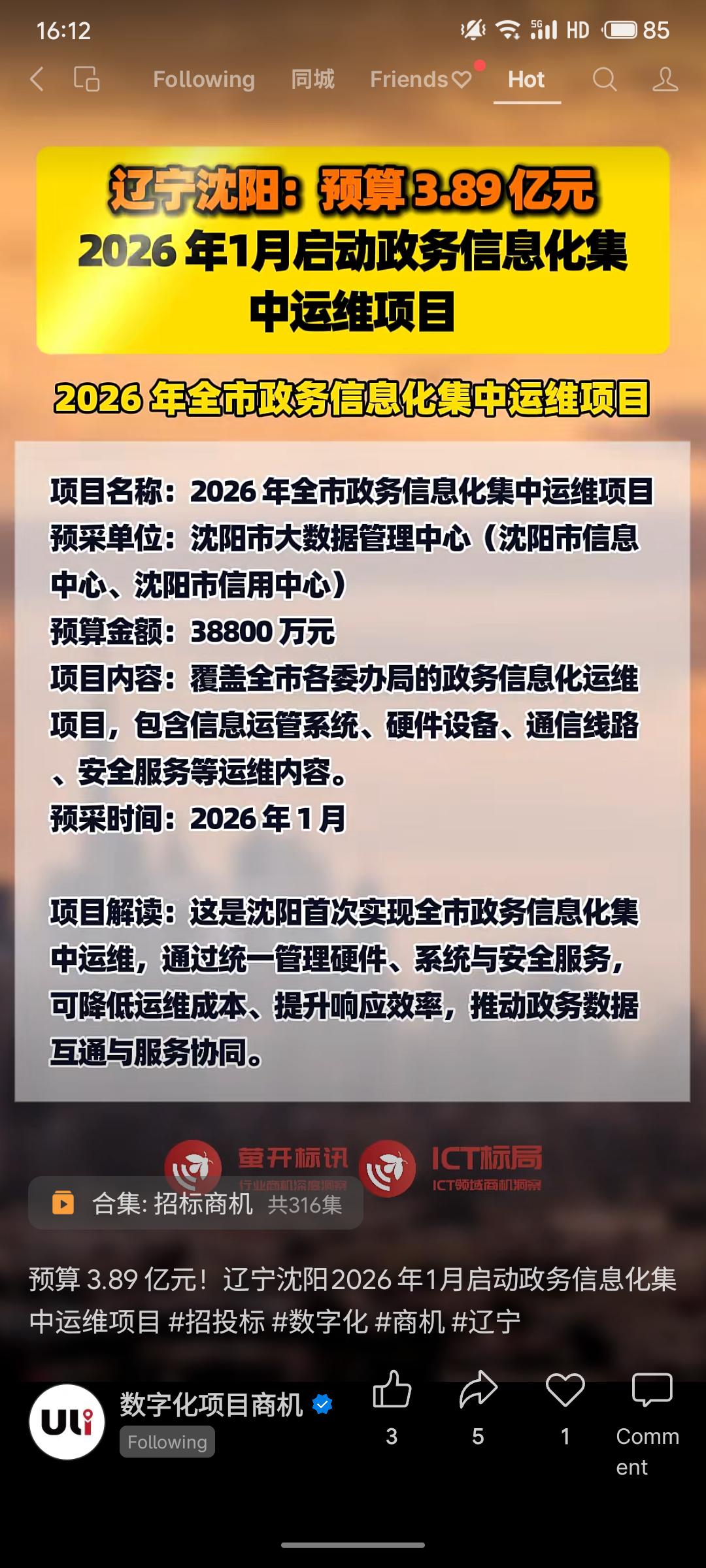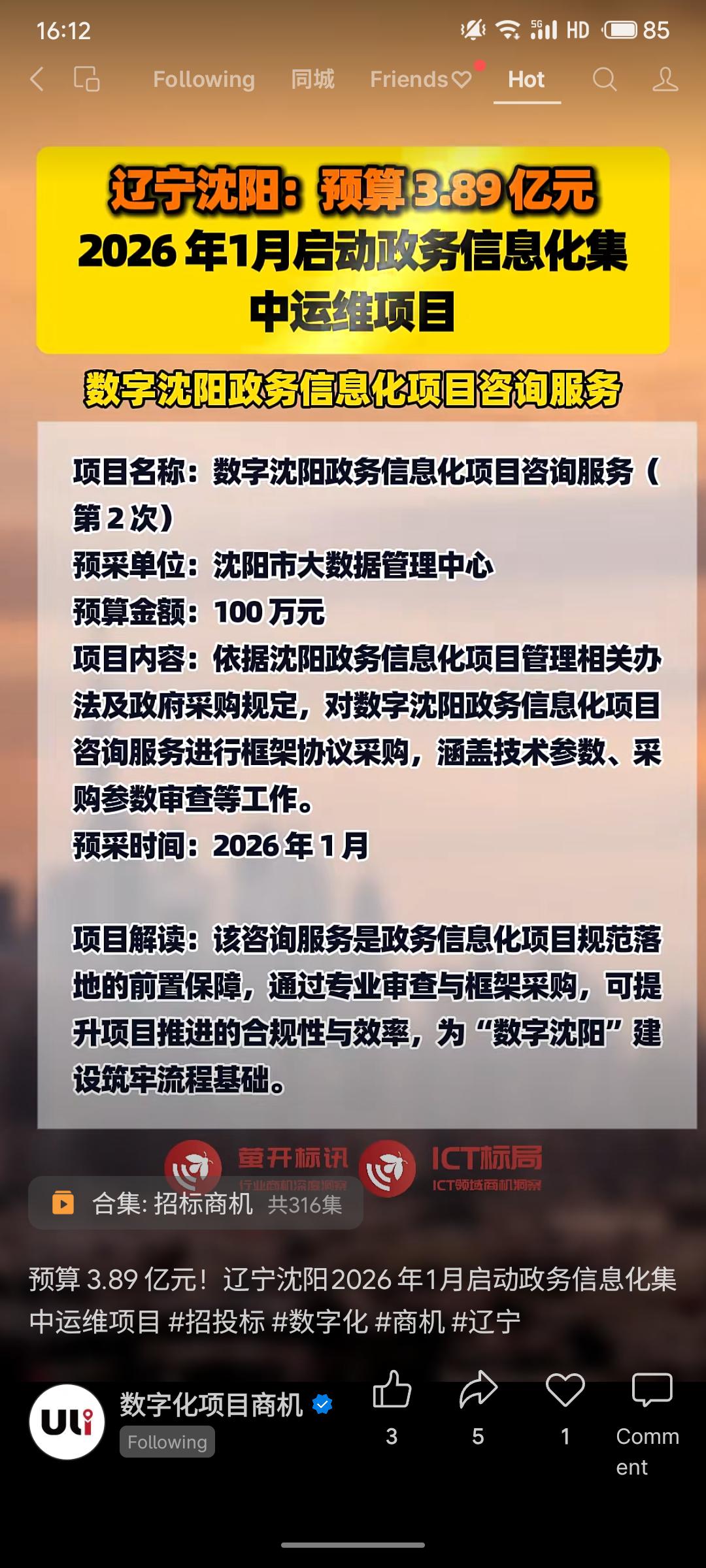 晒图笔记大赛辽宁省沈阳市将于2026年1月启动全市政务信息化集中运维项目,预算达3.89亿元。该项目由沈阳市大数据管理中心牵头,旨在对全市各委办局的信息系统、硬件及安全服务等进行统一运维管理,以降低成本、提升效率。同期还将开展预算100万元的相关咨询服务,为项目合规落地提供支持。此举标志着沈阳首次实现政务信息化运维的全市集中统筹。