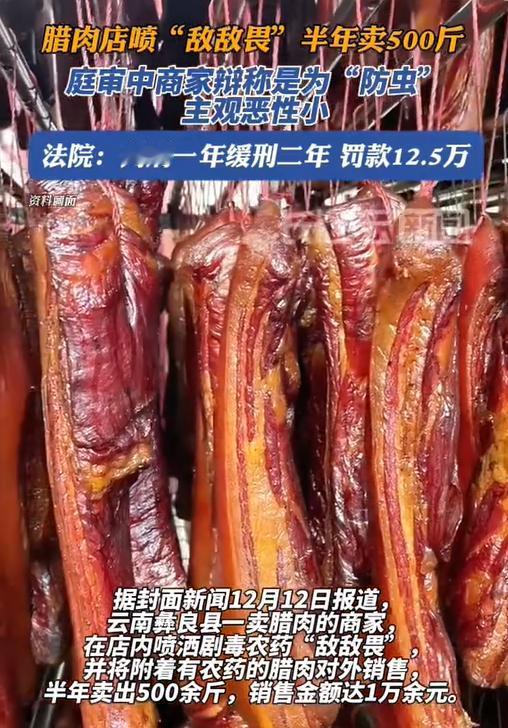 “丧尽天良!”云南一男子为赚取高额收入,竟将500斤腊肉喷上敌敌畏后卖出。可好景不长,男子的恶行最终败露,经检测结果显示肉里农药残留最高超标十倍。男子最终被依法带走,判决结果大快人心! “腊肉上喷敌敌畏?这种钱也敢挣!”只见老李蹲在自家熏房门口,盯着墙上那排黑红油亮的腊肉,边摸出了口袋里那瓶敌敌畏,边讷讷说道。 他犹豫过。手里的农药瓶标签泛黄,骷髅标志早就模糊了,可“剧毒”两个字还清清楚楚。去年腊肉长了虫,买家退货时骂得难听,于是今年他提前想了这招。 “少喷点,虫子死了就挥发没了。”他这么告诉自己,可在真的操作时,手却依然抖得厉害。刺鼻的气味弥漫开来,熏得他眼睛发酸。 第一批腊肉很快卖出去了。邻镇开饭店的王老板,开着面包车来拉货,边装车边夸:“老李,今年这肉色泽真好!”而蹲在一旁的老李,则干笑两声,递烟的手有点晃。 “听说最近有家腊肉生虫了,你这没事吧?”见老李家腊肉颜色板正,王老板点上烟的同时,随口问。但这话不说还好,说出老李心里咯噔一下,嗓门不自觉地提高:“我这祖传手艺,怎么可能有虫!” 此后那几天老李睡不踏实。半夜总梦见有人吃了肉倒下,惊醒时一身冷汗。老婆觉出不对劲,吃饭时问他:“你最近咋魂不守舍的?”老李扒拉着碗里的饭,闷声说:“没事,就是累了。”他偷偷去镇上药店转了转,看到急救农药中毒的药品都摆在外面,心里像压了块石头。 第二批腊肉喷洒时,他的手稳多了。甚至还琢磨出“经验”:喷完通风两天,味道就淡了。五百斤腊肉陆续出手,换回一万多现金。摸着厚厚的钞票,老李安慰自己:“这么多人买,真要出事早出事了。” 转折来得猝不及防。市场监督管理局的突击检查像晴天霹雳。穿制服的人员径直走向他摊位时,老李腿都软了。抽样、封存、询问,流程快得他反应不过来。旁边相熟的摊主老张凑过来低声问:“你惹啥事了?”老李张了张嘴,一个字都说不出来。 检测报告出来那天,老李正在家吃饭。电话里冰冷的声音报出“敌敌畏残留”时,筷子从他手里滑落。老婆看着他惨白的脸,声音都变了调:“你到底干了啥?!”老李瘫在椅子上,终于把事说了。屋子里死一般寂静,老婆红着眼眶,半天才挤出一句:“你这是害人啊……” 法庭上,公诉人宣读检测数据时,旁听席一阵骚动。老李低着头,听见买家代表气愤的声音:“这是拿人命当儿戏!”他不敢抬头看。当法官问到是否认罪时,他嗓子发紧:“我认……我就是糊涂,以为没事……” 判决下来了:缓刑,但罚款十二万五。走出法院时,阳光刺眼。村里人远远看着他,指指点点的声音顺着风飘过来。王老板的饭店早换了供货商,以前的老主顾见他都绕着走。老婆收拾行李回娘家的那天,在门口停了停:“等你想明白怎么做人,再说吧。” 如今老李的熏房空了。他常蹲在门口发呆,有时会突然站起来,把家里剩下的那瓶敌敌畏狠狠扔进山沟。有次在镇上遇见王老板,对方看他一眼,摇摇头走了。旁边卖菜的大娘叹气:“好好的手艺,非要走歪路。” 只能说,有些糊涂犯不得,有些底线碰不得。老李以为挥发的农药,最终渗进了自己的人生。那一万多块钱,买走了乡亲的信任,买走了半辈子名声,更买走了踏踏实实吃饭睡觉的安心。 要知道食品安全的弦,绷在每双手上,如果你松一松,别人的性命就可能晃一晃。黑心钱烫手,昧心饭难咽,这个理儿,总有人要等到付出代价时才懂。 对此您怎么看?欢迎大家到下方评论区留言共同讨论。 信息来源: 长江云新闻2025.12|《云南一腊肉店喷农药辩称“防虫”获刑》 文|沐琨 编辑|南风意史