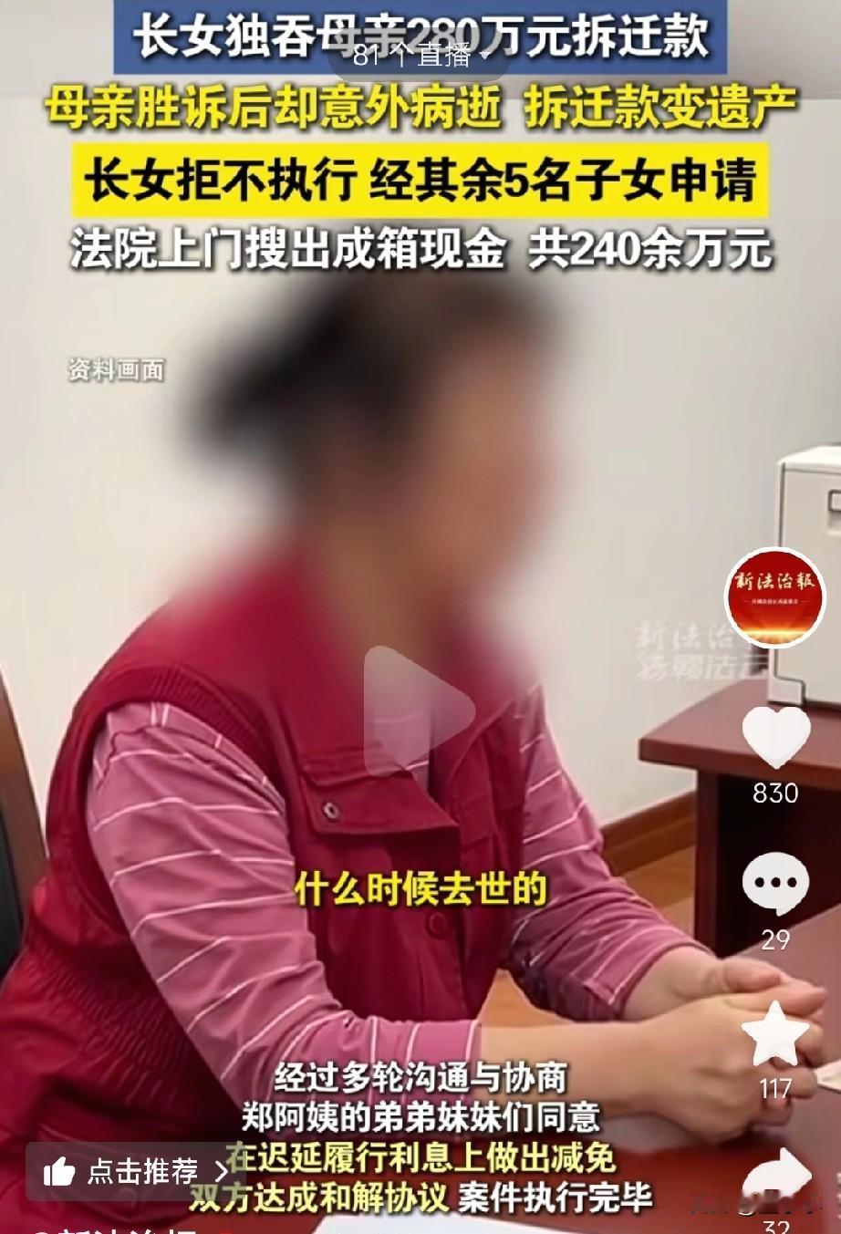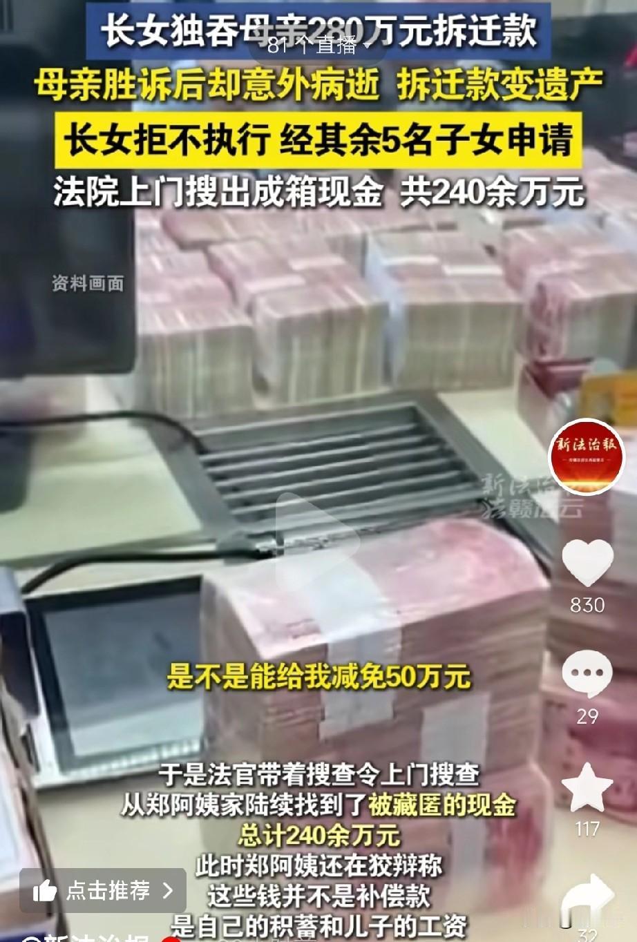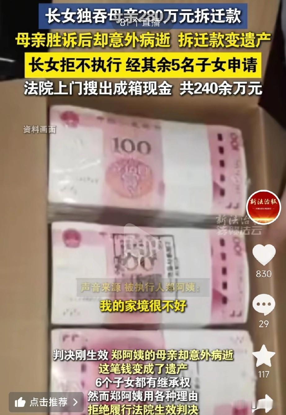 人性经不住考验,为了钱竟然和兄弟姐妹成仇人!本来可以一家和和睦睦的,没料到就因为自己私吞了母亲280万的拆迁款,兄弟姐妹闹到法院! 郑阿姨是家里的长女,下面有5个弟弟妹妹,但因为她的户口落在了老母亲的老宅内,后来老宅得了一笔280万的拆迁款。 郑阿姨领取后并没有交给母亲,反而还自己独占,因为这个事情,老母亲一纸诉状就把大女儿给告上法庭了。 但,老母亲胜诉后,很不巧又病逝了,于是这笔拆迁款就成了遗产,既然是遗产,那老人的6个子女都有继承权的,其余5个子女就申请了,法院也判了,这笔遗产6个子女都有份。 但,郑阿姨还是以各种理由来唐塞,拒绝了法院生效判决。 既然不配合,就要强行来了,法官带着搜查令过来,从郑阿姨家里搜出了240万的现金。 面对这种情况,郑阿姨还是一口咬定,这钱不是拆迁款,是自己的积蓄和儿子的工资。 最后,面对证据面前,郑阿姨不得不妥协,念在郑阿姨照顾老母亲的份上,法官也让几个女子都坐在一起调解,兄弟姐妹也让了一步,双方也达成和解协议。 难道,在金钱面前就没有亲情了吗?
