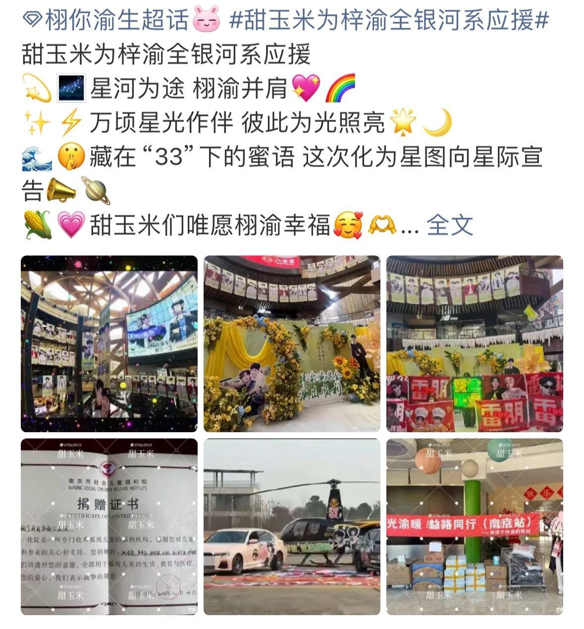 甜玉米为梓渝全银河系应援???栩你渝生这架势太夸张了,又是买星星,又是做公益,直升机,地铁应援都搞起来了,感觉田栩宁和梓渝谁也无法无法切割掉甜玉米,不知道这份"双刃剑"的爱能维持多久。