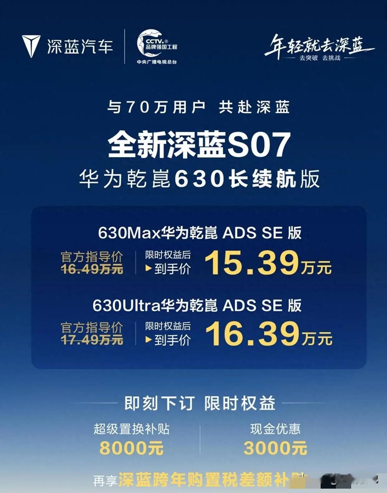 这是赤裸裸的现实! 主要汽车制造国电价: 德国:1度电3.31元人民币; 法国:1度电1.85元人民币; 美国:1度电1.30元人民币; 日本:1度电1.05元人民币; 韩国:1度电0.76元人民币; 中国:1度电0.52元人民币。 你看,咱们中国的电价,在这几个主要的汽车制造大国里,那是妥妥的“地板价”。这可不只是省几度电钱的事儿,它直接给咱们国家新能源汽车的爆发打下了好底子。也难怪2025年咱们的新能源车渗透率这么猛,全年平均都到了53%左右,有的月份甚至冲破了60%。 现在眼瞅着2025年就剩最后一个月了,如果你正琢磨着买台新车,好开回老家过春节,我这两天倒是关注到一款刚上市的新车,觉得特别值得你考虑。就是12月11日才出来的深蓝S07华为乾崑630长续航版。 我觉得这车最大的亮点,就是把“续航焦虑”给治得服服帖帖。咱们具体来看看它到底强在哪: 以前咱们买电车,最怕的就是半路没电,或者充电慢。但这台深蓝S07新出的630长续航版,直接把纯电续航干到了630公里(CLTC工况)。 电池够大: 它装了一块77.94千瓦时的大电池。 充电超快: 它支持3C快充,啥概念呢?就是电量从30%充到80%,只需要15分钟左右。这速度,喝杯咖啡的功夫,电就回来了,跑长途或者平时上下班,心里都特别有底。 现在买车不光看跑多远,还得看它“聪不聪明”。这车最大的卖点之一,就是全系标配了华为乾崑ADS SE智驾系统。 硬件顶配: 车上装了25个传感器(包括摄像头、雷达啥的),就像给车装了“千里眼”和“顺风耳”。 好用不贵: 这套系统能帮你搞高速领航、城区巡航,停车入库也能辅助你。关键是,这配置以前可能得几十万的车才有,现在15万级别的车上就给你标配了,性价比真的高。 座舱体验: 车里用的是高通骁龙8295P芯片,操作起来丝滑得很,加上AI大模型,你跟车机对话就跟跟真人聊天似的。 这车定位是中型SUV,尺寸是4750mm长,轴距有2900mm,空间相当宽敞。 动力充沛: 后置单电机,190千瓦的功率,290牛·米的扭矩,百公里加速7秒多,开着绝对有劲。 舒适度: 这个价位的车,深蓝在内饰上也没抠门,座椅舒适性、隔音啥的都做得挺到位,回老家带一家人,舒舒服服的。 最后说说大家最关心的钱。这车刚上市,官方给出的限时权益价是15.39万到16.39万元。 12月份买车的话,还有置换补贴、现金优惠这些福利,算下来性价比非常高。 总的来说,如果你预算在15万左右,想在年底前开台既有里子又有面子的纯电SUV回老家,这台深蓝S07华为乾崑630长续航版,真的可以拉进“必看清单”里了。