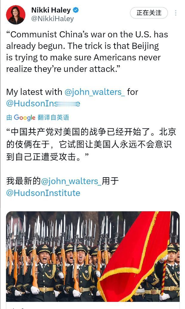 荒唐至极!12月18日,美国前驻联合国大使妮基·黑利发文:“中国共产党对美国的战争已经开始了。北京的伎俩在于,它试图让美国人永远不会意识到自己正遭受攻击。” 说白了,这就是赤裸裸的抹黑中国,只说中国在攻击美国,却没说出从哪里攻击,张口就来的行为,简直滑天下之大稽。 要知道,中国是一个以和平为核心的国家,根本不会主动去挑起事端,从新中国成立以来,没有任何一场战争是因中国的原因主动挑起的。 说实话,黑利这一发言,和“当街拉屎”没有任何区别,毫无底线可言,这可能与她当下被疏远的政治处境有很大的关系,抹黑中国的做法,不一定能成功,但是她确实是引起了世界的注意。 她急于抛出“中国威胁论”这种陈词滥调,为的其实是刷存在感,拉拢保守派的选票,只可惜,这套颠倒黑白的把戏早已被国际社会看穿。 说到底,这不过是一场为了个人政治私利的拙劣表演,根本撼动不了中国的发展步伐,只会让更多人看清美国部分政客的嘴脸,让他们沦为国际舆论场上的笑柄。