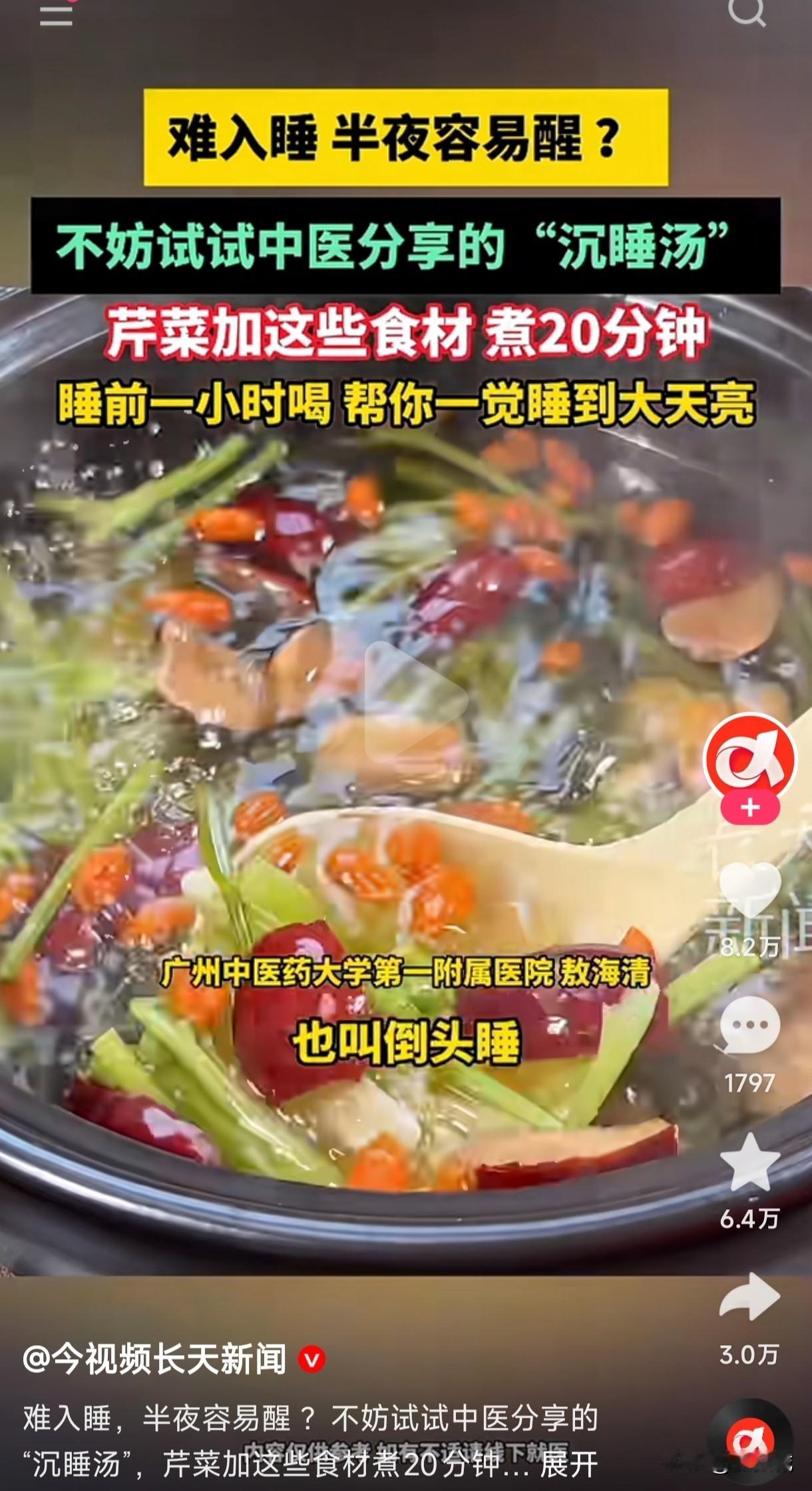睡不着,半夜又容易醒,不妨试试这个沉睡汤,一碗下肚立马倒头就睡,保你一觉睡到大天亮,又称之为倒头睡,话说真有这么神奇吗? 一位中医分享的沉睡汤,芹菜里面加入大枣和枸杞,煮20分钟左右,睡前一小时喝,保证一觉能睡到大天亮,不知道有没有人这样试过,话说这个大枣和枸杞也算是大补之类的,但芹菜不是有降血压的作用吗?这个汤煮出来肯定是能喝,但不能是每个人都适合喝吧?这是不是专门针对于睡不着,经常失眠容易醒的人,并且前提是他要没有任何基础病是吧? 不知道有高血压或者经常贫血的人能不能喝?他们喝了万一把睡眠没有调理好给送走了咋办?不知道有没有人尝试过这种倒头睡的方法?真的有这么神奇吗?