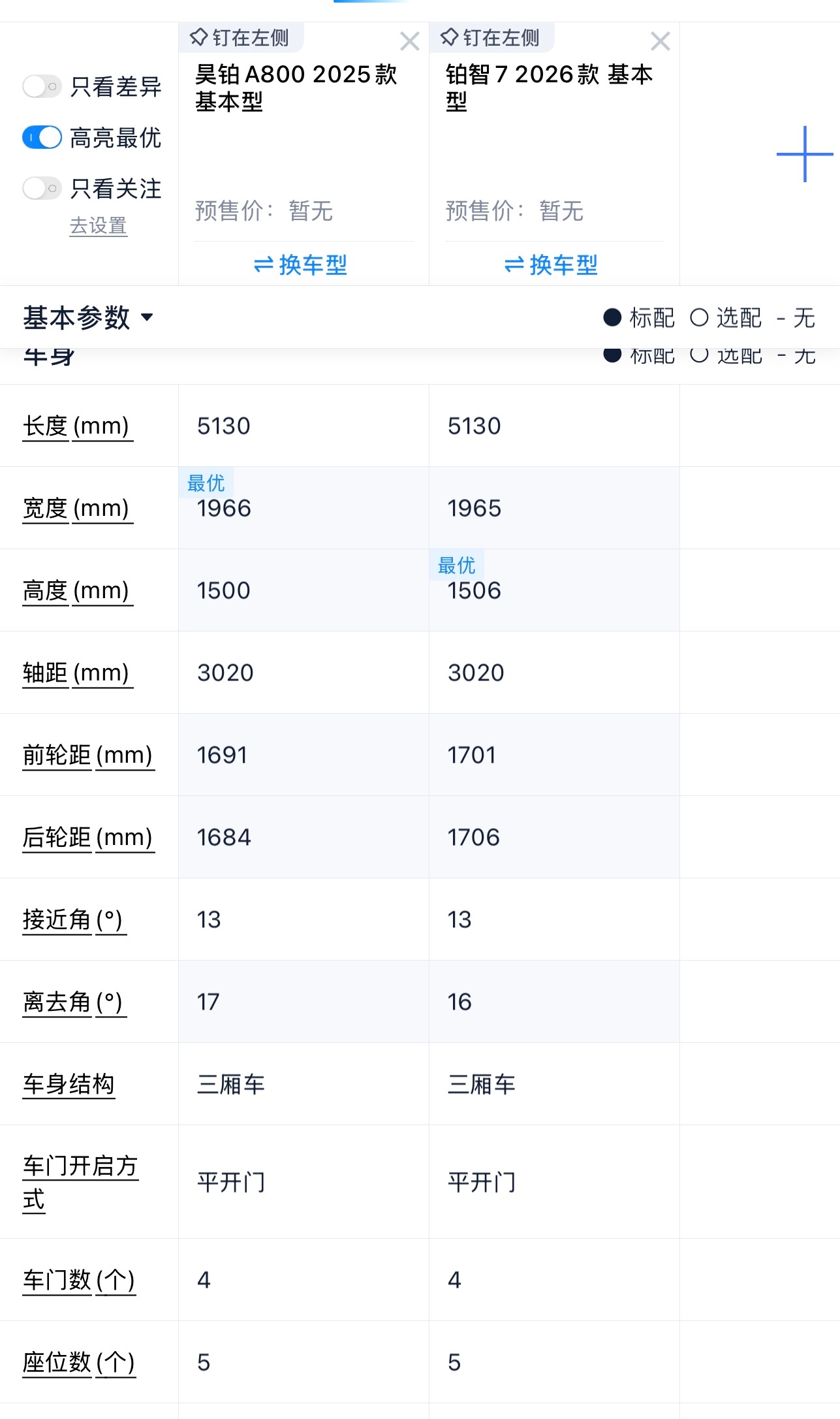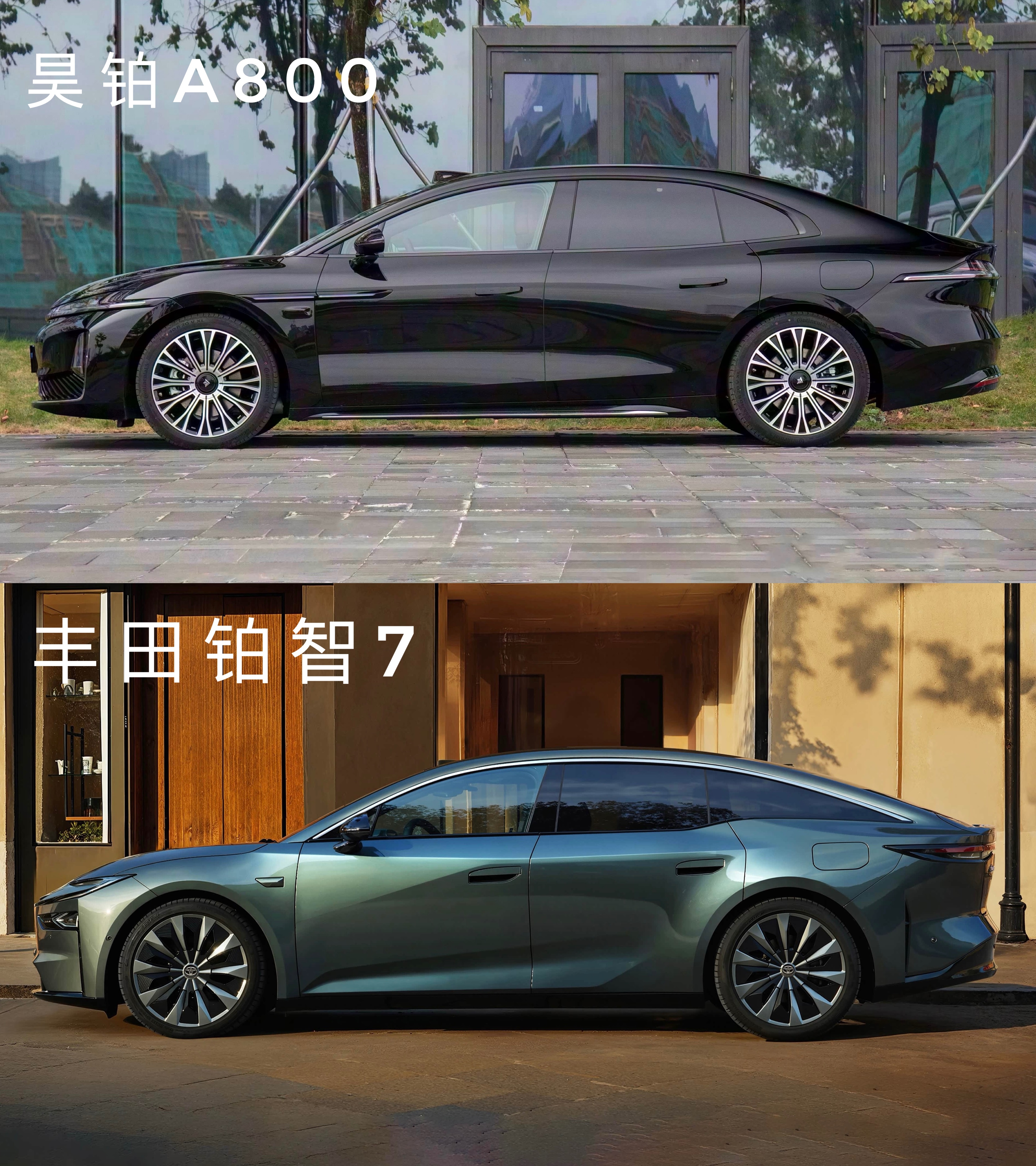 昊铂这个品牌目前确实没太打开市场,行业内关注度不算高,以至于我之前也没开研究过他家的A800,就知道有华为的智驾和座舱。今天刷到这个车开始盲订了,我也仔细看了下,感觉这车和丰田铂智7姿态挺像的。一看参数,确实挺接近。估计就是同平台的产品,一个打PHEV、一个打BEV。