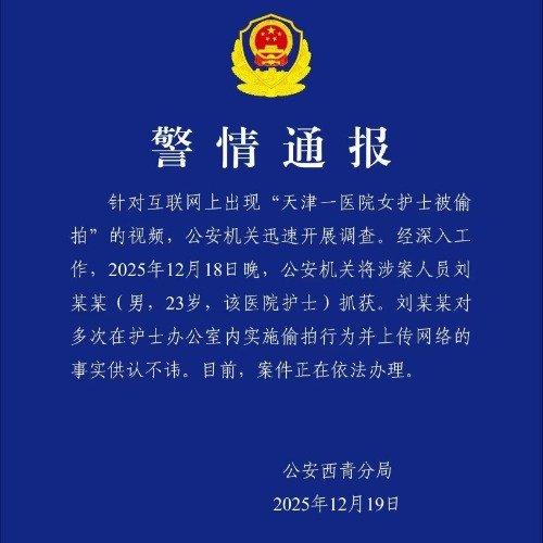 偷拍者被抓了。 经过警方深入工作,2025年12月18日晚,公安机关将涉案人员刘某某(男,23岁,该医院护士)抓获。 刘某某对多次在护士办公室内实施偷拍行为并上传网络的事实供认不讳。 目前,案件正在依法办理。 不知道对这种行为的处理罚力度是什么样的? 给那些偷拍者一个严厉的教训,才能有力的打击偷拍行为。