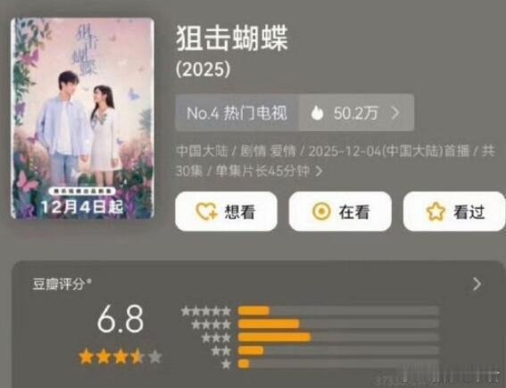 由陈妍希和周柯宇主演的电视剧《狙击蝴蝶》开分,某瓣评分6.8。