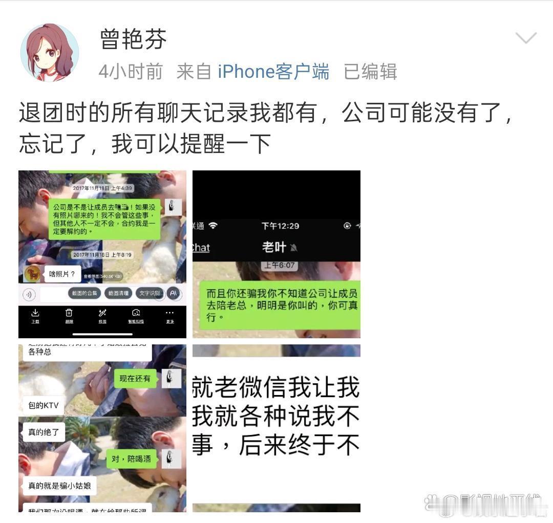 曾艳芬曝聊天记录12月19日,曾艳芬再发文,晒出与丝芭”叶总“聊天记录,并表示,退团时所有聊天记录自己都有,如果公司忘记了,自己可以提醒一下。