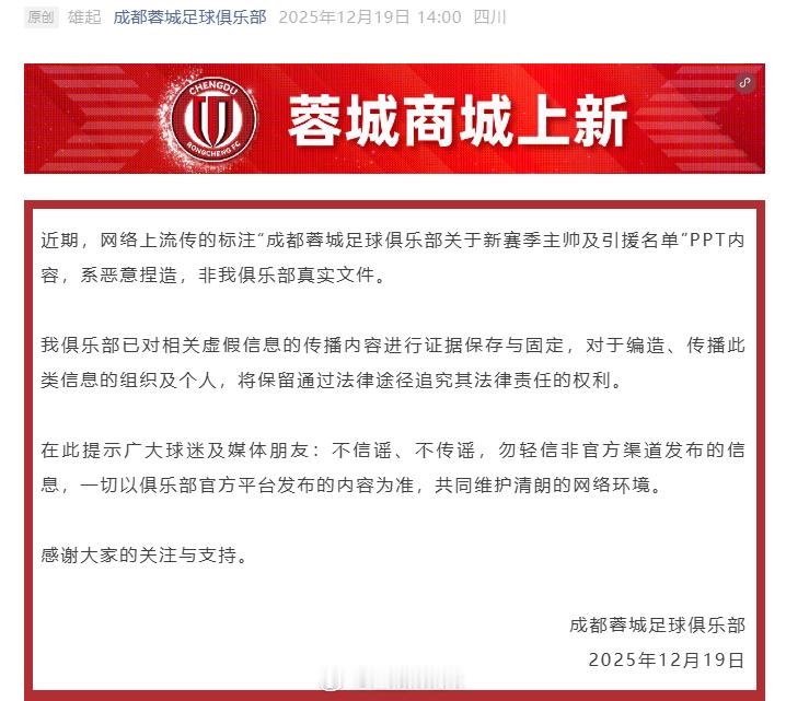 成都蓉城官方:近期网络上流传的标注“成都蓉城足球俱乐部关于新赛季主帅及引援名单”PPT内容,系恶意捏造,非我俱乐部真实文件。看了一下,太假了……然后成都蓉城现在不用微博了,专用公众号发东西,是不是怕被喷太多层?