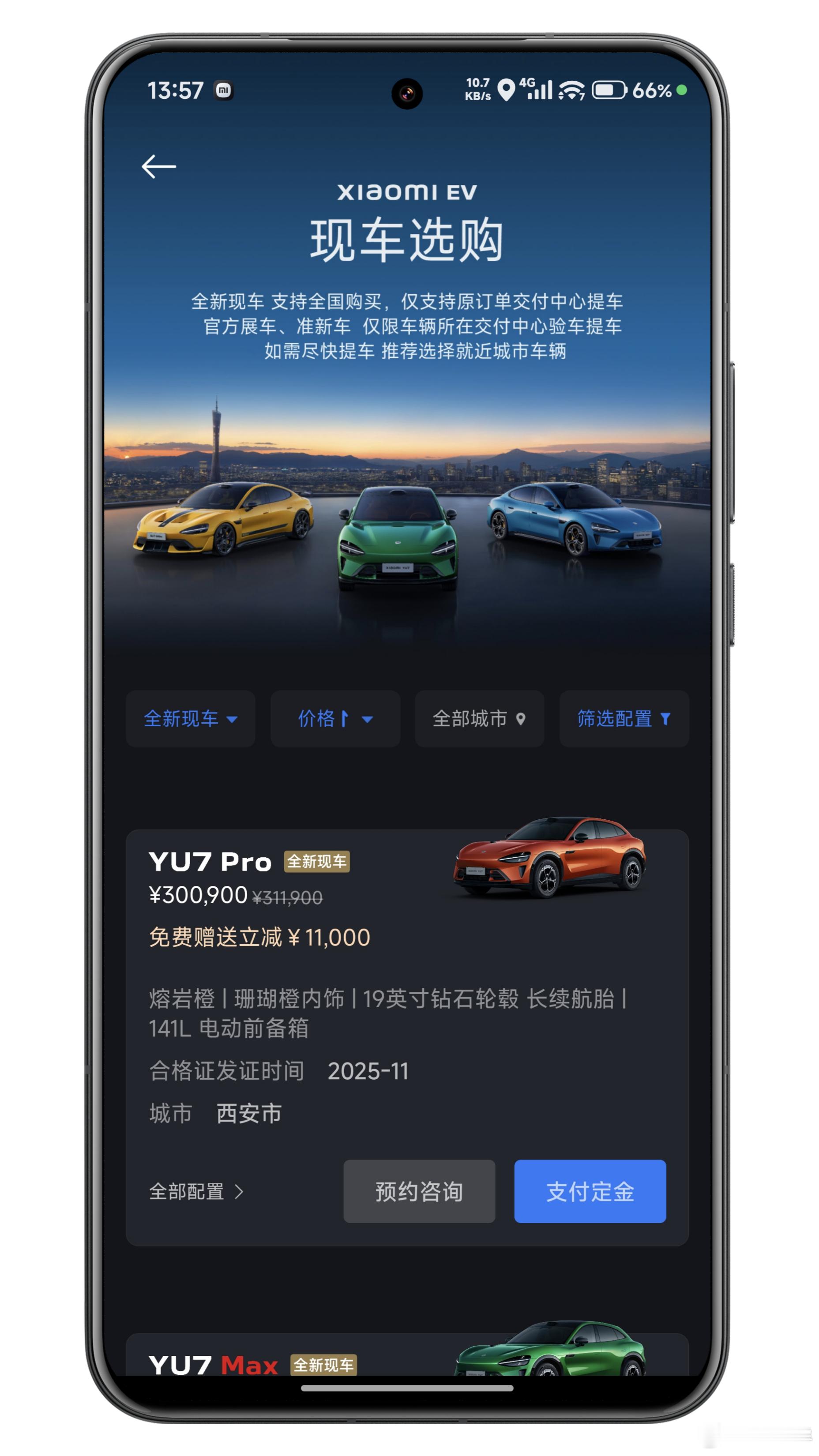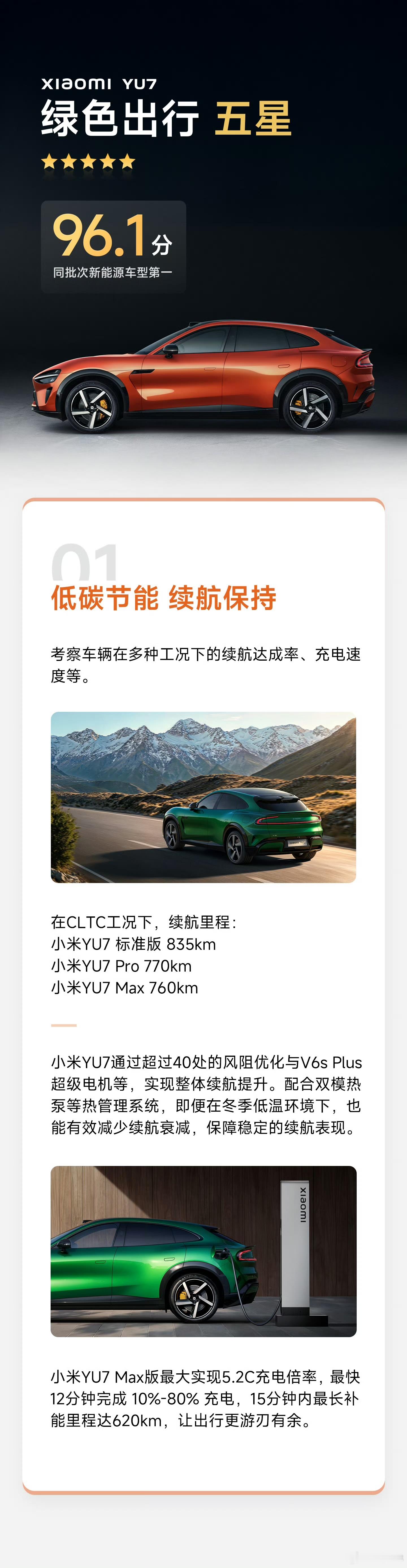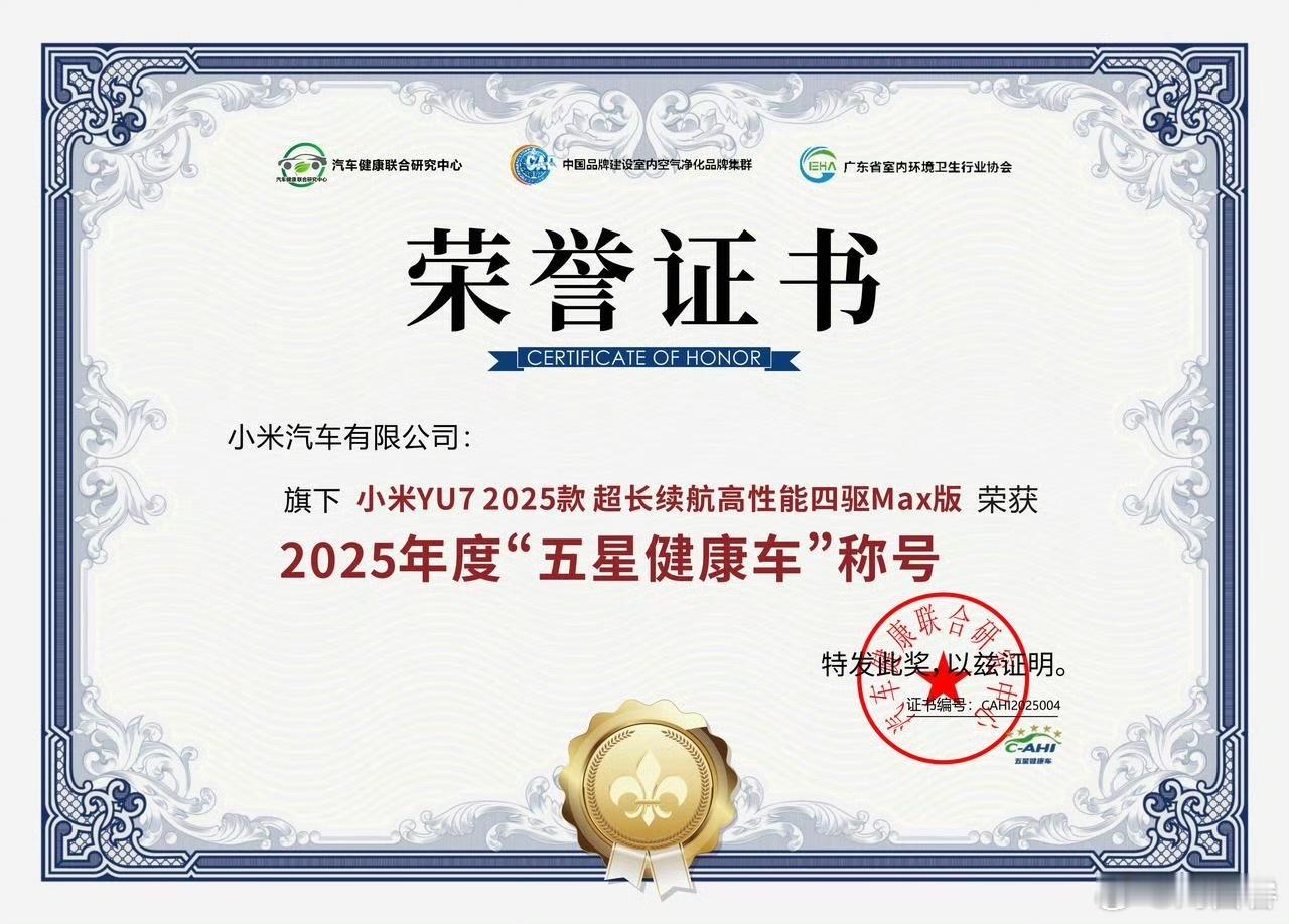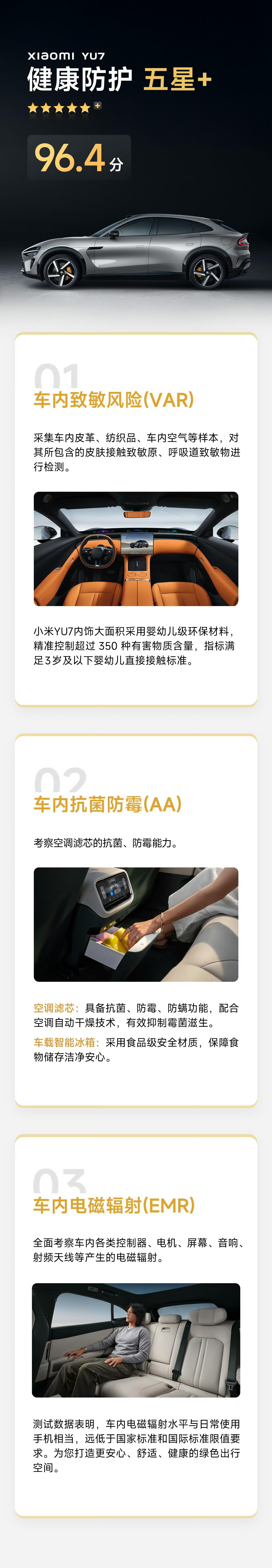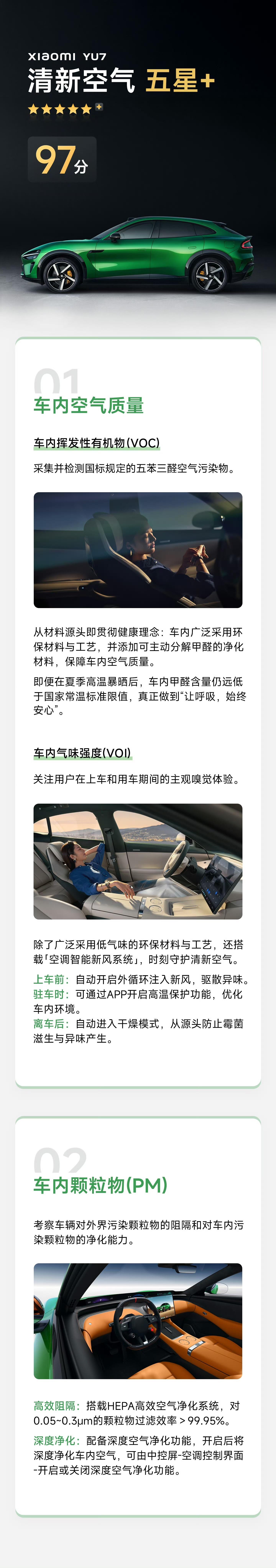 刚看到雷总发了 获得的新奖项「五星健康车」,YU7 在三大测评维度都是最高级,其中绿色出行维度更位列新能源车第一🏆「五星健康车」含金量其实挺高,它是由汽车健康联合研究中心基于中国汽车健康指数 (C-AHI) 结果颁发的荣誉称号,分为清新空气/健康防护/绿色出行三项清新空气主要关注车内空气质量和颗粒物,而 YU7 全系标配 HEPA 高效空净系统(图6)自然能实现五星 + 的最高级别健康防护主要关于车内致敏风险、车内电磁辐射等,YU7 内饰的用料大面积采用婴幼儿级环保材料,控制超 350 种有害物质,不仅意味着安全,更代表了材质亲肤、低敏的顶级舒适感。我作为 YU7 车主,也坐过很多亲朋好友的新车,YU7 是我坐过所有新车里异味最小的,没有之一!最后是绿色出行子项,这个相信大家都认可,YU7 的续航和续航达成率在同档是绝对领先的水准(图7)比如我的 YU7 Max 最低做到过 12.4kWh 的能耗(图8)对于高性能四驱 SUV 来说,这个表现非常棒了,所以自然能在绿色出行维度拿到同级第一目前 YU7 锁单后等车周期较长,着急提车的朋友也可以看看小米汽车 App 现车分区(图9)有很多 YU7 Pro / Max 现车今年内能提车,还能享受购置税补贴哦