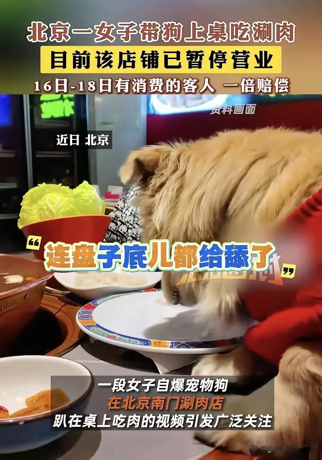 都这么光明正大了吗? 12.18日,一视频中,北京某餐厅,一女子带狗上桌吃涮肉,宠物狗直接趴在桌上,舔食盘子里的生羊肉卷,女人还在视频中得意洋洋的描述:连盘底都舔了! 这个视频引发了很多网友的不适与批评:狗就是狗,是她的宠物,她视作家人,但在别人眼中,它就是一个动物,它舔过的盘子再给顾客用,这不是膈应人吗? 有人说,责任在于餐厅,因为他们监管不力,首先不该允许狗子进来,然后更不应该同意让它上桌。现在大伙都在抵制这家店,老板肠子都要悔青了吧! 这家涮肉店目前已经停业整顿,不仅给当日就餐的顾客退了款,还要付出一倍的赔款,早知今日,当时咋就不制止呢?