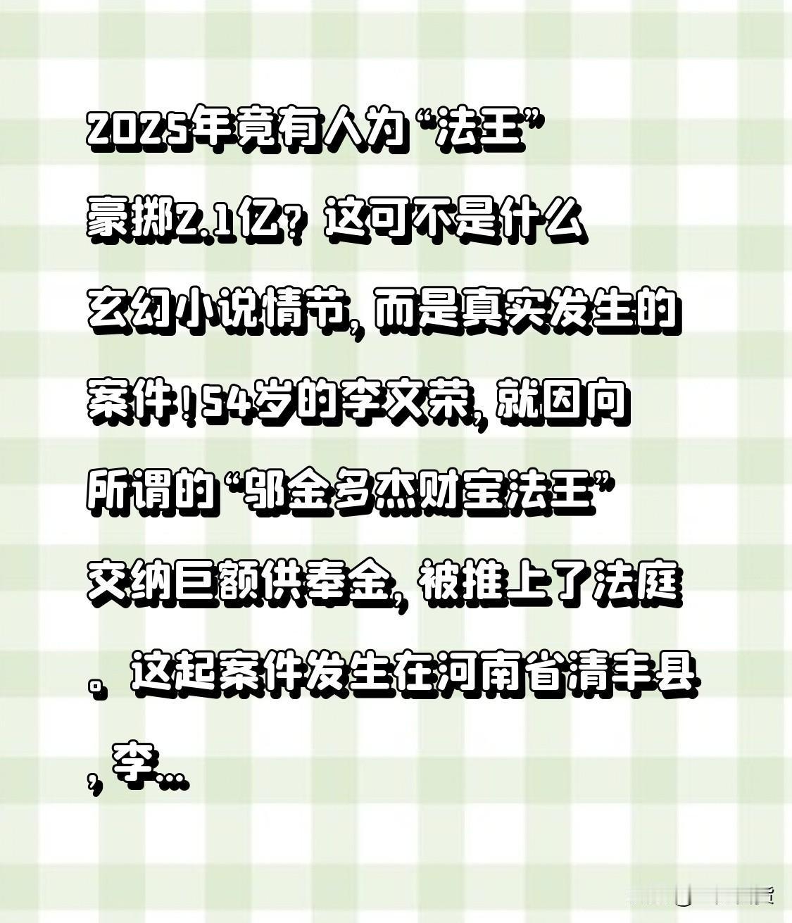 2025年竟有人为“法王”豪掷2.1亿?这可不是什么玄幻小说情节,而是真实发生的案件!54岁的李文荣,就因向所谓的“邬金多杰财宝法王”交纳巨额供奉金,被推上了法庭。 这起案件发生在河南省清丰县,李文荣向自称“邬金多杰财宝法王”的王金阁,交纳了高达2.1亿元的“供奉金”。这可不是小数目,足以让普通人瞠目结舌。而这背后,还隐藏着一个更大的秘密。李文荣所在的涉案组织“三会一部”,被控敛财总额竟高达2.2亿元!这个组织打着宗教的旗号,实则进行非法敛财活动,严重破坏了法律的实施。他们利用人们对宗教的信仰和敬畏,诱导信徒交纳巨额供奉金,甚至承诺给予各种神秘的力量和庇护。然而,这些所谓的“法王”和“神秘力量”,不过是一场精心策划的骗局。李文荣的案件,就是这场骗局被揭露的冰山一角。 迷信不可取,法律是底线!这起案件再次提醒我们,要时刻保持清醒的头脑,不被迷信所迷惑。对于这起案件,你有什么看法呢?快来评论区留言,一起讨论吧! 升官发财传说 论天上的财宝 郑州法王 何为法王 无上的法王 财宝王 信息来源:百度。 相关链接