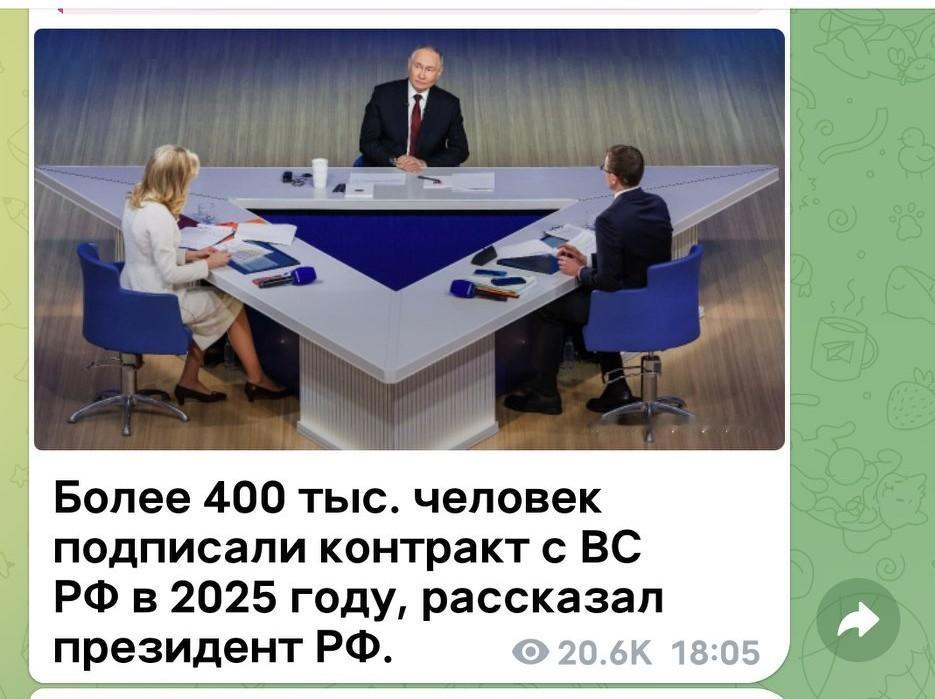 普京连线:俄罗斯总统表示,2025年已有超过40万人与俄罗斯武装力量签约。(俄通