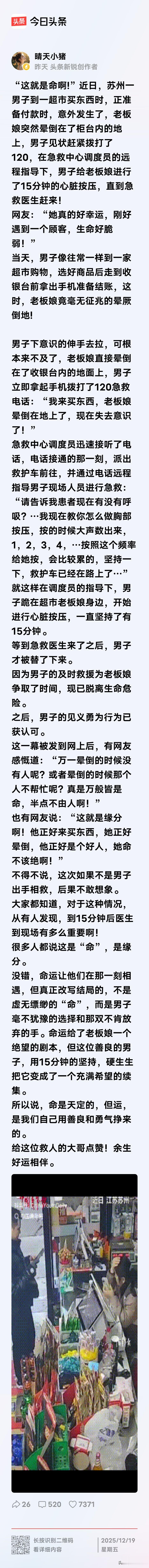 好心的顾客救了店主的命,看了让人非常的感动!这个到超市买东西的男子,是我们每个人都应该学习的榜样,我们这个社会,人与人之间就应该如此,看到别人有难的时候,就应该挺身而出,有一份力尽一份力,救人一命,这是何等大的功德!向这个男子致敬,为这个男子点赞!
