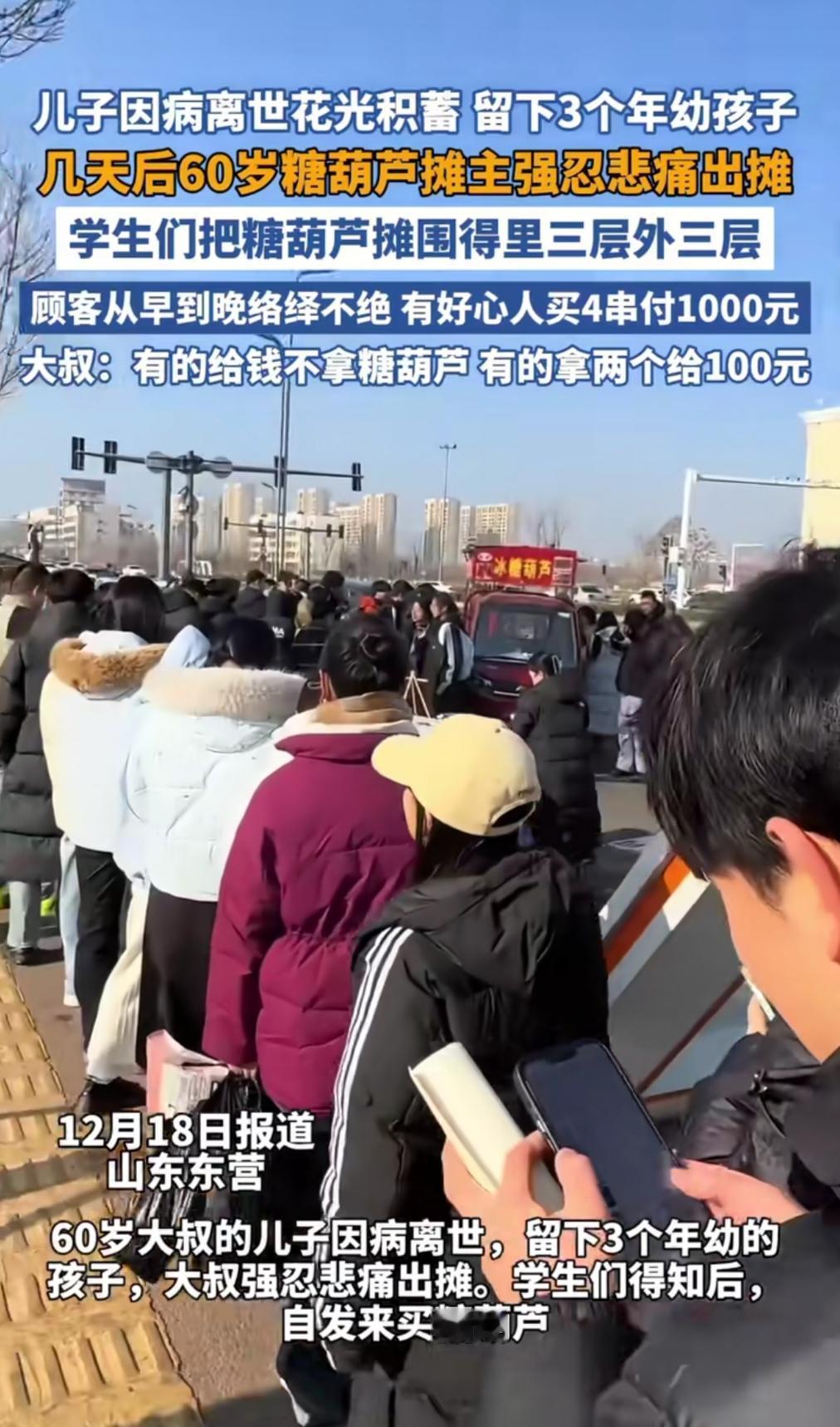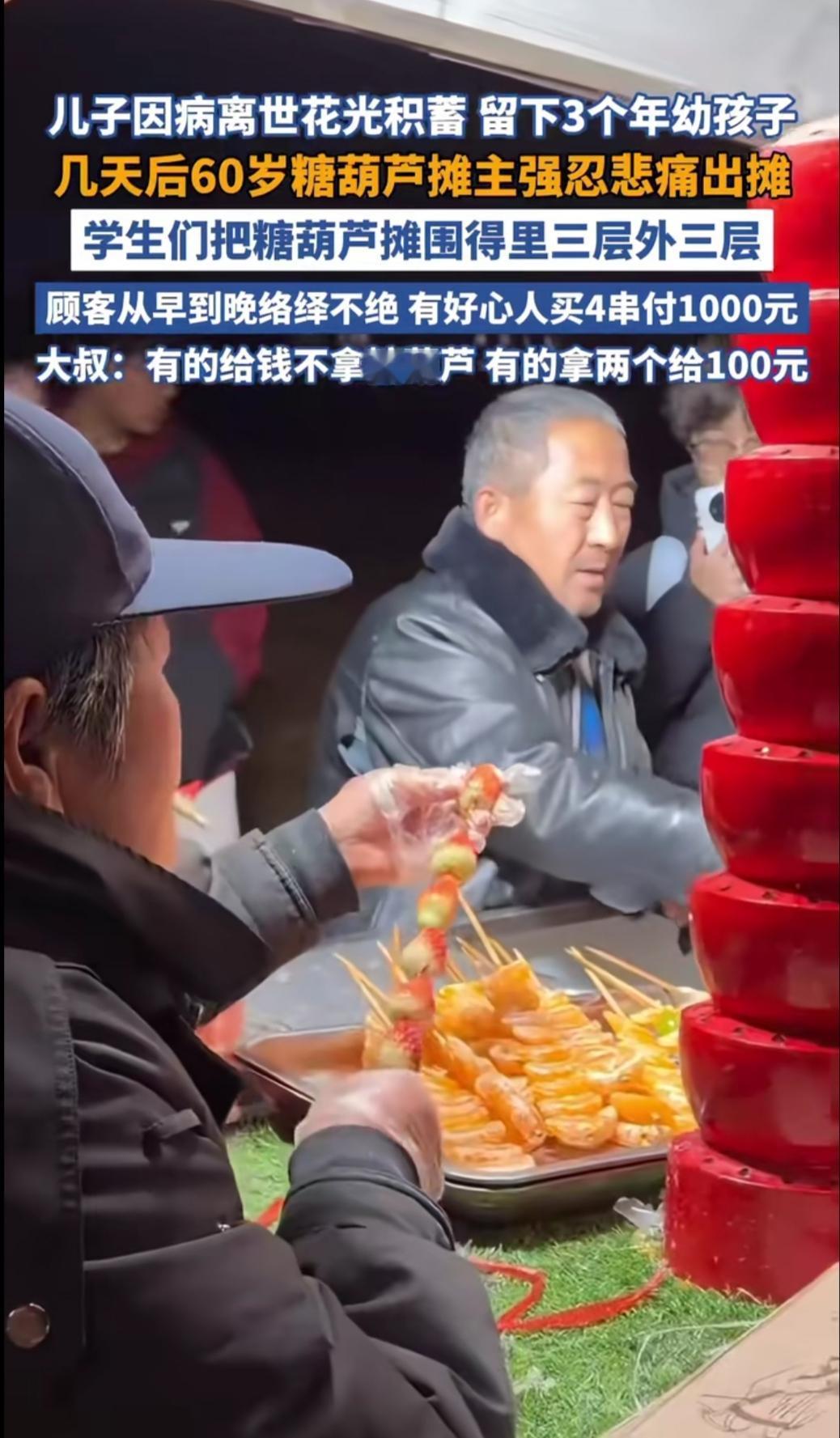 谁能想到,山东东营一个普通的糖葫芦摊,会在寒冬里攒起满街的温暖?60岁大叔刚经历丧子之痛,还得扛起3个孙辈的生活,强忍悲伤出摊的样子,看哭了无数人。 大叔的儿子因病离世,为治病花光了所有积蓄,只留下三个年幼的孩子。才过几天,大叔就抹干眼泪推着糖葫芦车出摊了——他得挣钱,撑起这个支离破碎的家。 消息传开后,附近的学生们最先赶来,把摊位围得里三层外三层。有人买4串付1000元,有人拿两串塞100元就走,还有人直接给钱却不要糖葫芦。大叔红着眼说,从没见过这么多好心人,这份情他记一辈子。 其实这世间从不是冰冷的,一句关心、一次援手,哪怕只是买一串糖葫芦的善意,都能帮一个身处困境的人扛过最难的坎。这串裹着糖霜的山楂,不仅甜在嘴里,更暖在了人心底。