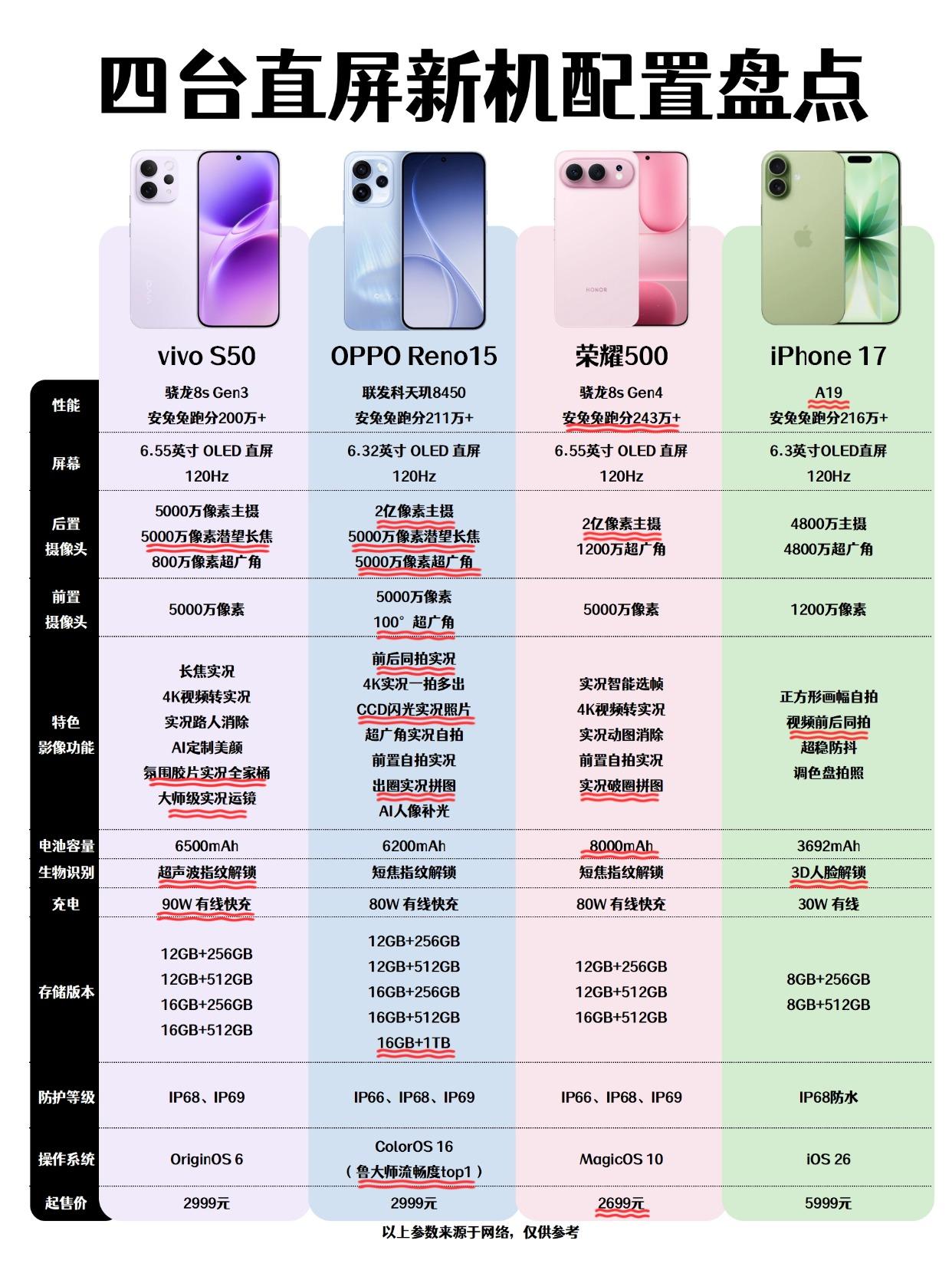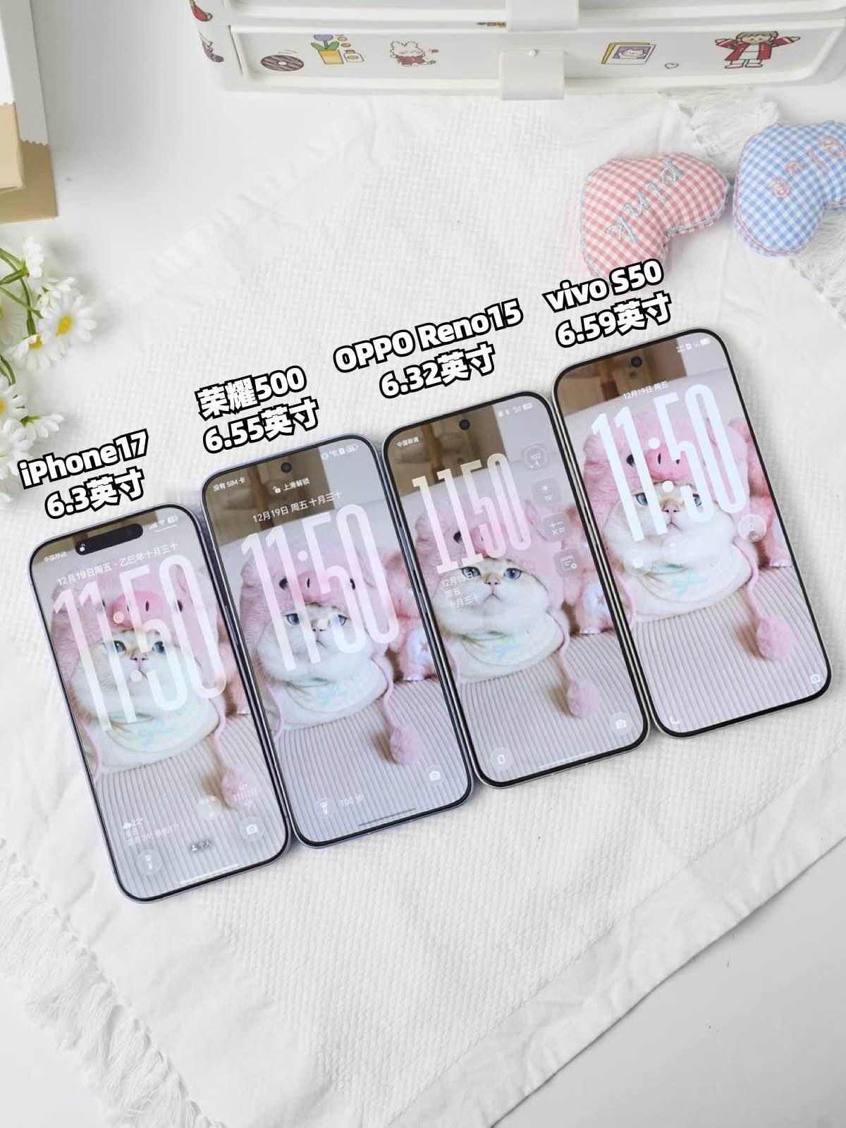 四台直屏新机极限四选一!我是真纠结了… 2025年真的是直屏党的春天! 把vivo S50、OPPO Reno15、荣耀500和iPhone17放一起看, 正面清一色超窄边框直屏看着是真的赏心悦目。 今天就带着大家好好盘一盘这四款热门直屏新机: 📱iPhone17: 小屏性能党狂喜6.3 英寸 120Hz 直屏,单手持握感刚好。 A19+iOS26 是真稳,刷剧打游戏都不卡,但 3692mAh 电池 + 30W 充电,跟安卓比确实弱,5999 起的价相对也有点贵了 📱OPPO Reno15: 拍照党闭眼入6.32 英寸 120Hz 直屏,2 亿主摄 + 5000 万长焦太顶,拍远景裁切都清晰,前后同拍、出圈拼图巨出片。6200mAh+80W 能撑一天,还有 IP68/69 防护,2999 起这价香疯了。 📱vivo S50: 全能性价比选手6.55 英寸直屏,骁龙 8s Gen3 性能稳,5000 万三摄 + 长焦实况够用,6500mAh+90W 快充续航拉满,IP68/69 防护也到位。 📱荣耀 500: 续航卷王,8000mAh电池几乎找不到对手,6.55 英寸直屏 + 2 亿主摄够日常用,2699 起适合预算紧的宝子。 说实话,如果预算够且执着iOS,iPhone17还是挺不错的, 但如果想花更少的钱get更全面的配置,国产直屏才是真香!这三台国产直屏机里面选的话,我个人感受是这样的: - 1️⃣、只想要性能和大电池的,选荣耀500; 2️⃣、喜欢拍照的可以从S50和Reno15这里挑,相机上都有5000万潜望长焦,但Reno15的2亿像素主摄参数高一点,前置镜头自拍画幅也会更广。 3️⃣、另外很火的出圈实况拼图,Reno15和荣耀500才支持,但Reno15可以多个主体出圈,可玩性更高,live实况照片玩法也会更多一些。 4️⃣、至于系统体验估计Reno15的ColorOS 16系统会稍好一点,毕竟鲁大师流畅度第☝🏻。 当然了各人有各人的看法,以上纯属我个人感受,仅供参考~ 直屏手机 iPhone17 OPPOReno15 vivoS50 荣耀500 手机推荐 数码分享 高颜值手机