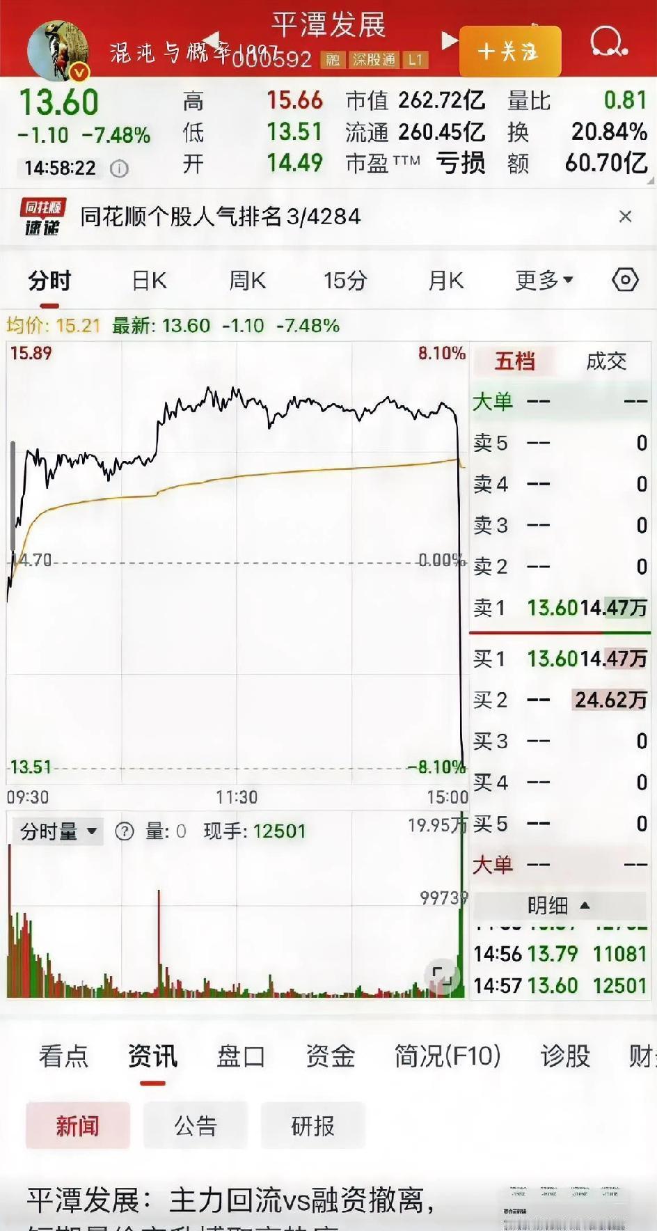 最近A股最让人揪心的事儿,莫过于平潭发展这波尾盘偷袭了,不少股民直呼“禽兽操作”,彻底被这只妖股伤透了心。 这只票之前可是风光无限,两个月时间股价直接暴涨3.5倍,十几二十次登上龙虎榜,从不起眼的小票一路涨到近300亿市值,成了福建板块的人气龙头。要说基本面吧,其实挺一般,连续好几年亏损,今年前三季度才勉强盈利3100万,市盈率都飙到600多倍,远超行业平均水平,明眼人都知道这就是纯资金炒作的妖股,靠着平潭封关的政策预期,游资搭台散户唱戏,玩起了击鼓传花的游戏。 前期游资把股价拉起来后就慢慢撤了,后面全靠散户大本营的席位互相接力,维持着高热度。12月19号这天,早盘走势还算平稳,甚至一度涨了快五个点,不少散户看着走势稳当,还想着抄底赚一波,谁知道尾盘直接上演“惊魂十分钟”。 下午2点50分之后,风云突变,量化资金突然开始砸盘,仅仅6万手的抛单,就把原本涨着的股价硬生生砸到水下,短短几分钟跌幅就拉满十多个点,从红盘直接变绿盘,分时图看着就像一把断头铡刀。这种偷袭太猝不及防了,散户根本没时间反应,刚追进去的当天就浮亏近10%,持股的更是眼睁睁看着利润瞬间蒸发,股吧里瞬间哀鸿遍野,有人晒出账户截图吐槽“这操作太恶心”,还有人直言“以后再也不敢碰妖股了”。 其实这波尾盘偷袭说白了就是资金心虚,怕周末出监管政策,提前抢跑避险。A股向来有周末监管高位股的惯例,这些炒作资金心里没底,就想着趁尾盘大家反应不过来的时候赶紧兑现收益,而且尾盘砸盘成本低,还能制造恐慌让散户跟风抛售。好在后来集合竞价有35万手的承接盘,说明市场认可度还在,不然跌得更惨。 这次事件也给散户提了个醒,妖股炒作看着刺激,其实风险大得很。资金说撤就撤,根本不跟你讲道理,尾盘偷袭这种操作防不胜防。那些纯靠炒作起来、脱离基本面的股票,就像随时会爆的气球,看着飞得高,一旦资金撤离,摔下来只会更疼。 现在大家最关心的就是下周一怎么走,有人慌着要割肉,有人觉得主力会护盘修复。但不管后续走势如何,这波尾盘偷袭已经伤了不少股民的心,以后再遇到这种纯炒作的妖股,估计大家都会多留个心眼,毕竟谁也不想再经历一次这种“禽兽式”偷袭了。股市里贪心往往伴随着风险,跟风炒作妖股,终究还是得小心驶得万年船。 来源:张佳ZHJ