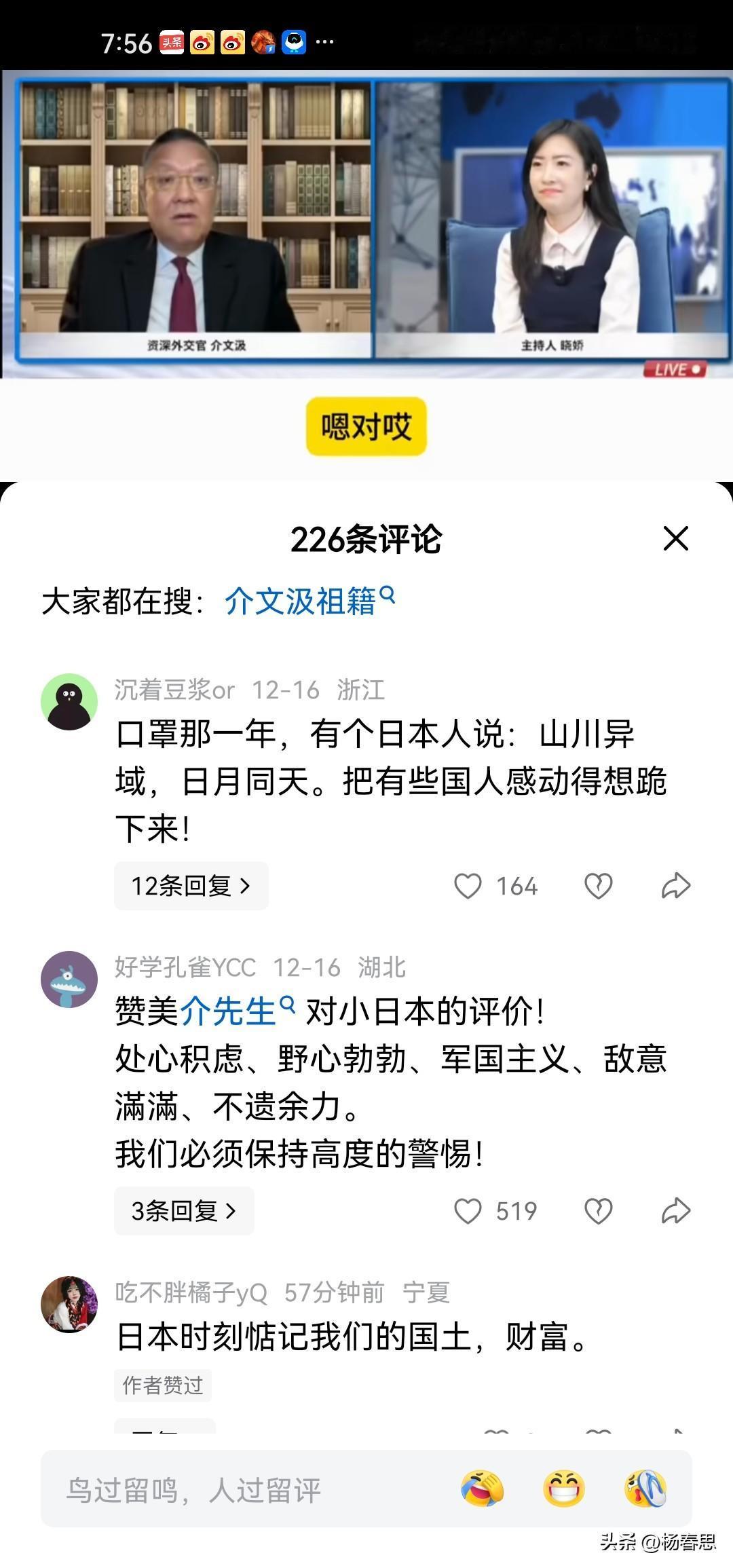 台湾学者介文波强调,日本对中国的威胁远大于美国对中国的威胁。因为日本就在中国的旁边,它会千方百计阻止中国大陆统一台湾,还会处心积虑寻找机会把手伸向中国大陆,想要中国的国土和资源,这是由他们国内的资源,国土,思想,性格与情势所决定的,这个谁也不能改变 。日本的黑手从来没离开台湾,哪怕1949年之后,还在暗中处心积虑的经营台湾,他一直在插手台湾中国 今天台湾受日本影响比美国还深。日本是个斤斤计较的民族,相反中国有一点大度,有一点大度啊,就是不计小节,就是因为不计小杰让中国损失惨重,希望我们吸取教训,不要再放任这种对敌人的慷怀了。