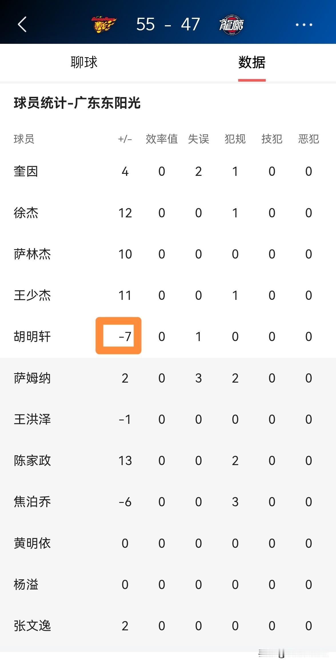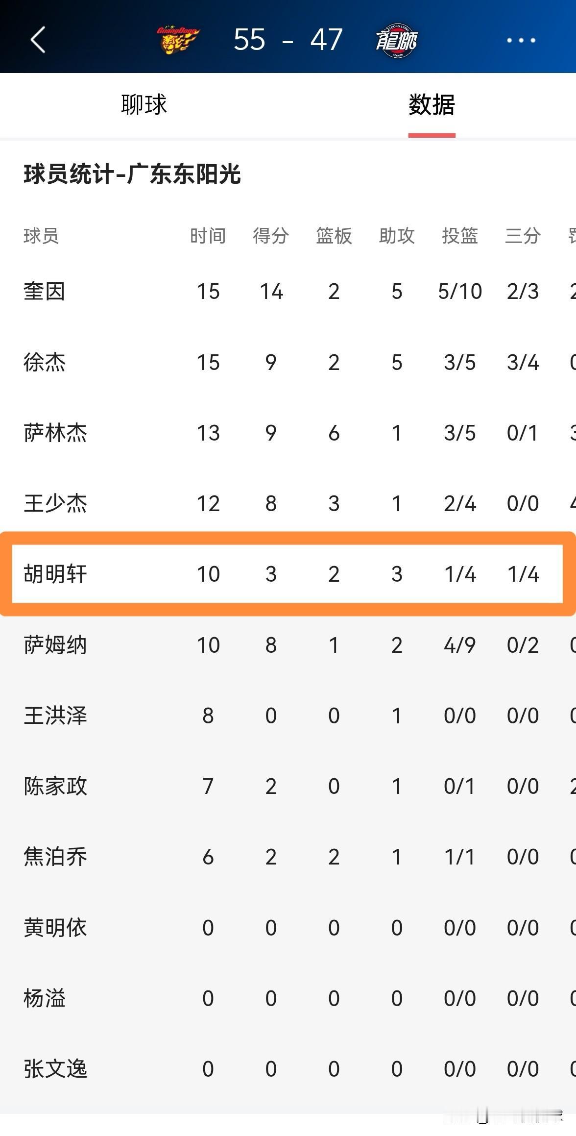 广东东阳光超级后卫胡明轩真是太悲催了,他竟然惨遭主帅杜峰的弃用!在今天广东东阳光主场迎战广州朗肽海本的上半场比赛中,胡明轩由于表现低迷惨遭杜峰教练的弃用。 在前两节比赛中,胡明轩仅仅首发出战10分钟,三分球4中1非常低效的得到3分,他的场上正负值为全队最低的-7。 值得一提的是,在双方的第二节比赛中,胡明轩在大部分的时间里都没有获得出场机会。
