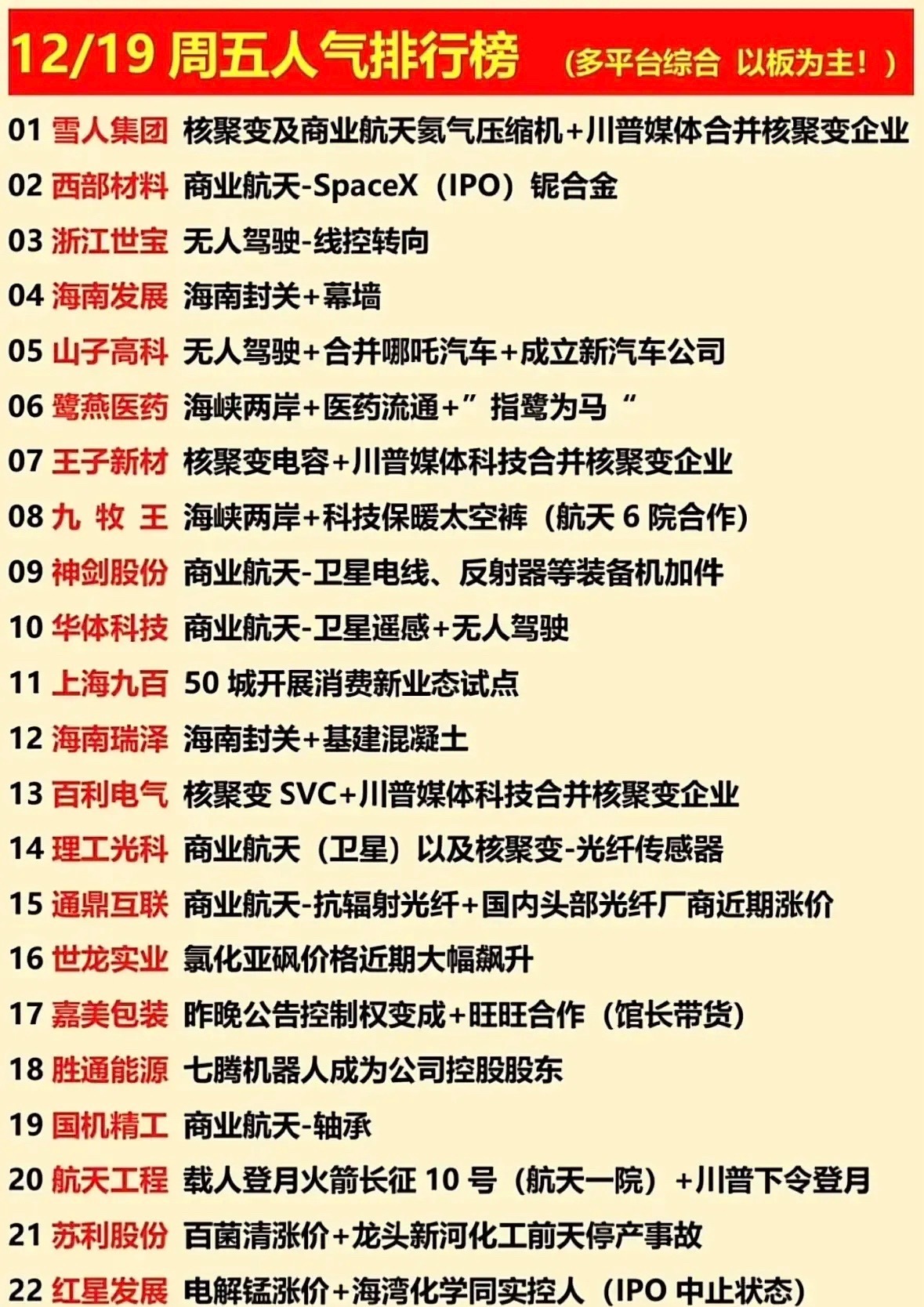 12/19人气排行榜梳理分析今日人气榜覆盖核聚变、商业航天、无人驾驶、海南封关等主线赛道,同时包含涨价、股权变更、停产事故等事件驱动型题材;个股题材多呈现交叉属性,且频繁绑定川普相关、载人登月等市场热点事件,反映资金对题材联动性和事件催化的高度关注,人气炒作以“赛道+事件”的组合逻辑为主。1. 雪人集团:位列人气榜首位,主打核聚变及商业航天氦气压缩机,还叠加川普媒体合并核聚变企业的事件催化。作为核聚变赛道核心标的,多重题材共振推高其市场人气,是当日题材炒作的核心龙头之一。2. 西部材料:聚焦商业航天赛道,关联SpaceX铌合金业务,铌合金是航天领域关键材料,依托SpaceX的IPO预期及商业航天产业热度,成为该细分领域的人气标的,获资金重点关注。3. 浙江世宝:主打无人驾驶-线控转向题材,线控转向是无人驾驶核心技术环节,是实现车辆智能控制的关键,凭借无人驾驶赛道热度与技术稀缺性,跻身人气榜前列。4. 海南发展:紧扣海南封关题材,同时涉及幕墙业务,海南封关是区域发展重要政策节点,幕墙业务与海南基建、地产配套相关,政策预期下成海南板块人气代表标的之一。5. 山子高科:布局无人驾驶赛道,叠加合并哪吒汽车、成立新汽车公司的产业动作,既受益于无人驾驶赛道热度,又因车企整合事件获得额外关注度,人气快速提升。6. 鹭燕医药:主打海峡两岸+医药流通题材,还因“指鹭为马”的趣味梗增加话题性,医药流通是医药板块基础赛道,叠加区域题材,事件与题材结合推高其人气。7. 王子新材:涉及核聚变电容题材,关联川普媒体科技合并核聚变企业的事件,电容是核聚变设备核心部件,事件催化下成为该赛道的人气跟风标的。8. 九牧王:叠加海峡两岸+科技保暖太空裤题材,还与航天6院合作,科技保暖太空裤结合航天技术,实现消费与航天赛道跨界融合,区域题材进一步丰富其炒作逻辑。9. 神剑股份:聚焦商业航天赛道,主营卫星电线、反射器等装备机加件,是商业航天产业链配套环节,为卫星制造提供核心零部件,依托产业风口成细分领域人气标的。10. 华体科技:同时布局商业航天-卫星遥感与无人驾驶两大热门赛道,卫星遥感是商业航天重要应用方向,与无人驾驶形成题材共振,双重赛道加持下关注度显著提升。11. 上海九百:受益于50城开展消费新业态试点的政策驱动,作为上海本地消费标的,聚焦消费新业态布局,政策利好叠加区域属性,成消费板块人气代表。12. 海南瑞泽:紧扣海南封关题材,主营基建混凝土业务,海南封关将带动区域基建发展,混凝土作为基建核心材料直接受益,成为海南板块的人气标的。13. 百利电气:主打核聚变SVC题材,叠加川普媒体科技合并核聚变企业的事件,SVC是核聚变关键设备,事件与赛道热度结合,使其成核聚变板块重要人气标的。14. 理工光科:布局商业航天及核聚变-光纤传感器题材,光纤传感器是两大赛道核心元器件,跨赛道技术布局让其获得资金和市场的双重关注。15. 通鼎互联:聚焦商业航天-抗辐射光纤题材,同时是国内头部光纤厂商且近期光纤涨价,抗辐射光纤是航天通信关键材料,叠加涨价的业绩驱动,题材与基本面共振推高人气。16. 世龙实业:因氯化亚砜价格近期大幅飙升获关注,氯化亚砜是化工重要原料,价格上涨直接利好公司业绩,属于涨价驱动型标的,成化工板块人气股。17. 嘉美包装:因昨晚公告控制权变更,且与旺旺合作、叠加馆长带货的直播电商题材,控制权变更带来业务布局预期变化,合作与带货打开消费渠道想象空间。18. 胜通能源:因七腾机器人成为公司控股股东引发关注,机器人是热门赛道,控股股东变更意味着公司或向机器人领域转型,产业转型预期成人气提升核心驱动。19. 国机精工:聚焦商业航天-轴承业务,轴承是航天装备核心零部件,商业航天发展带动航天轴承需求,依托细分领域技术优势,成商业航天板块人气标的。20. 航天工程:关联载人登月火箭长征10号,还叠加川普下令登月的事件催化,载人登月是航天重大事件,长征10号是核心装备,事件与产业结合使其人气高涨。21. 苏利股份:因百菌清涨价,且龙头新河化工前天停产事故进一步助推价格上行,百菌清是农药重要产品,停产导致供给收缩,业绩预期驱动其成农业化工板块人气股。22. 红星发展:因电解锰涨价,且海湾化学同实控人带来关联预期,电解锰是新能源、冶金重要原料,价格上涨叠加关联事件,使其成资源板块人气标的。总结本次人气榜个股围绕核聚变、商业航天、无人驾驶等主线赛道展开,同时叠加政策、事件、涨价等多重催化,题材呈现“赛道+事件”的联动特征;部分标的还实现跨赛道、跨领域的题材融合,反映当下市场资金偏好热点题材与事件驱动的结合,投资者需关注题材持续性与基本面的匹配度,规避纯题材炒作的短期波动风险。股市有风险 投资需谨慎!