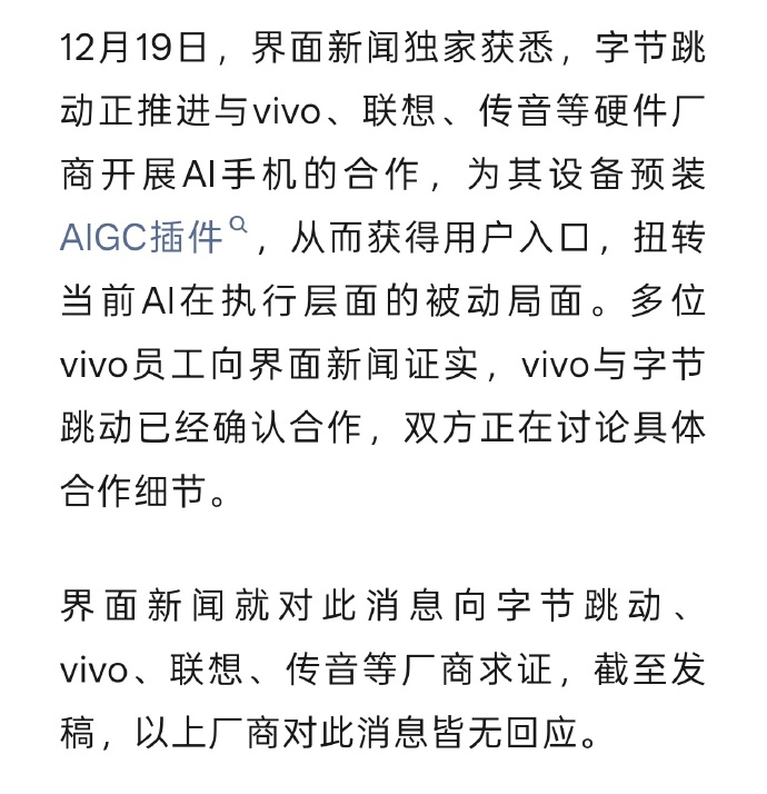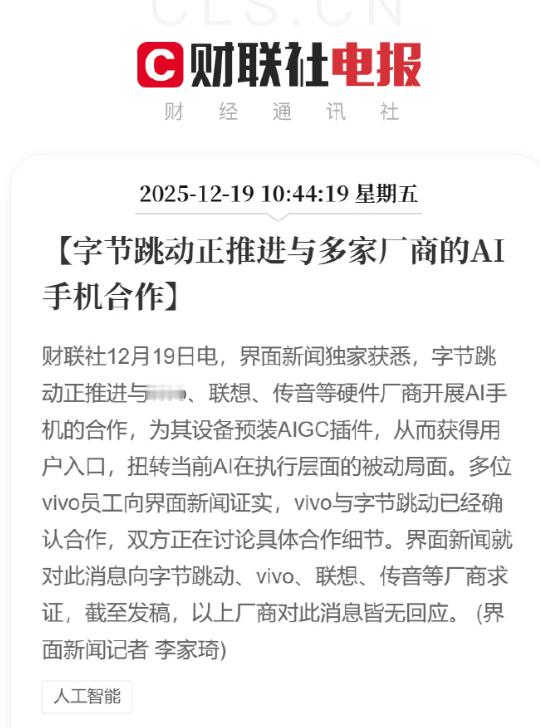 哇靠,vivo也在和字节搞AI手机了?好啊好啊,到时候越来越多厂商都开始搞AI手机你APP不答应就别上架应用商城了呗而且很多厂商都有自己的APP,听歌的,看视频的,购物的。各种类型的都有,到时候厂商自己出的APP可以用AI操作,把用户习惯改了用别的APP就好笑咯曝字节正推进与多家厂商的AI手机合作
