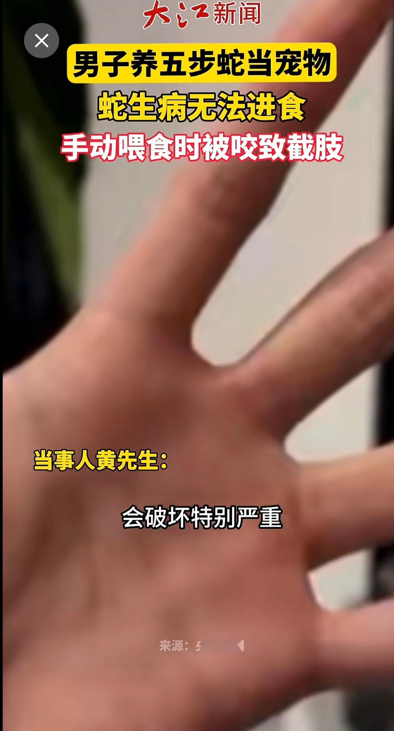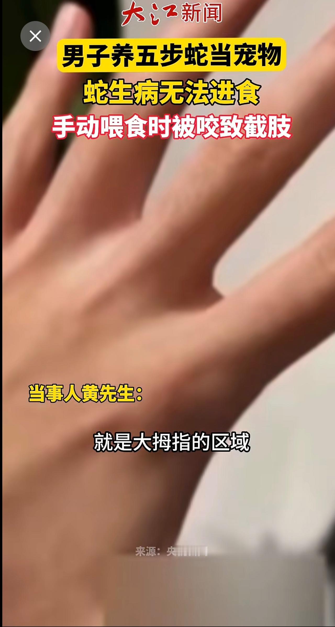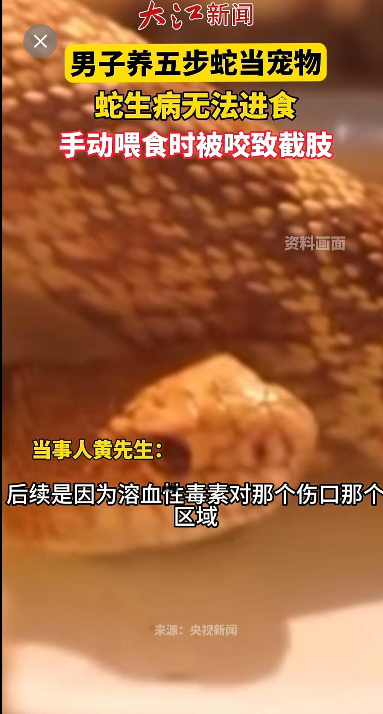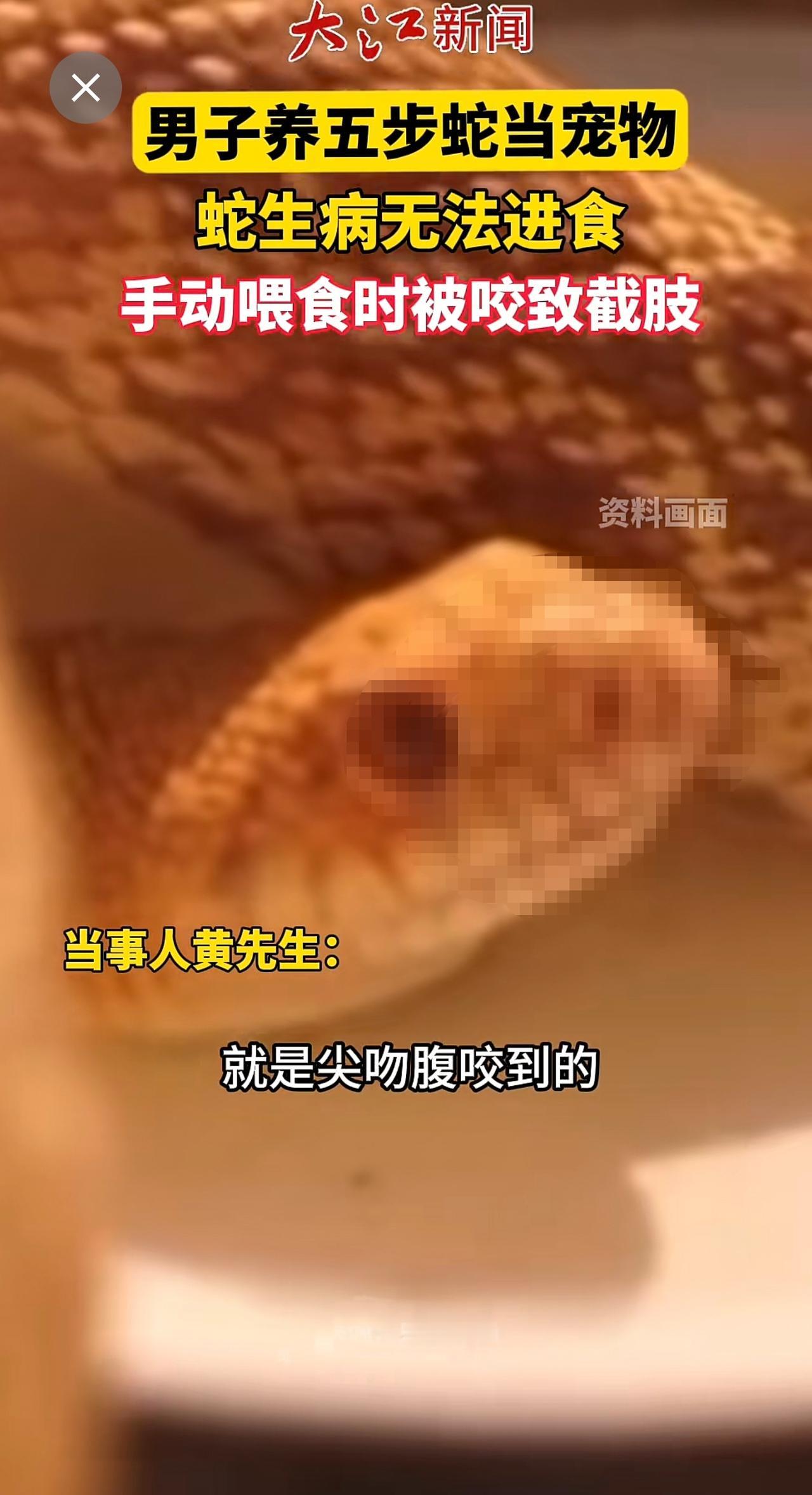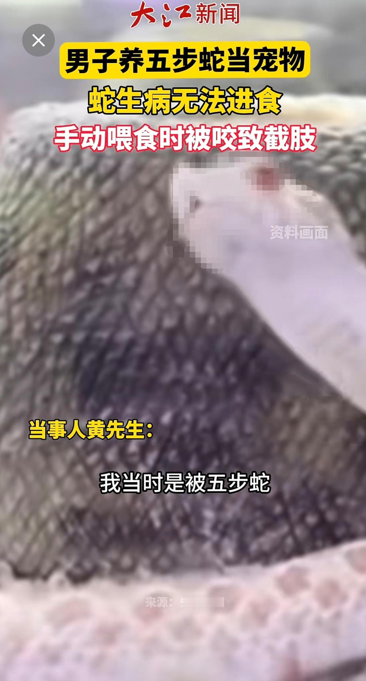 北京一男子养五步蛇当宠物,蛇生病无法进食,手动喂食时被咬致截肢。