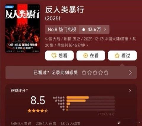 反人类暴行豆瓣开分8.5反人类暴行 年度黑马非它莫属!从默默无闻到全民安利,《反人类暴行》用电影级质感征服观众,豆瓣 8.5 分恰是实力证明,上👖追就对了!