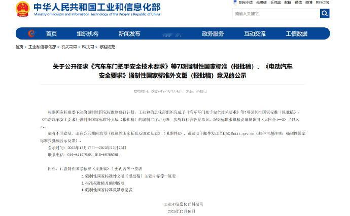 明确禁止全隐藏式门把手隐藏式门把手侧面碰撞场景存在弊端 据工业和信息化部官网12月16日消息,工业和信息化部组织完成了《汽车车门把手安全技术要求》(以下简称《要求》)等7项强制性国家标准(报批稿)、《电动汽车安全要求》强制性国家标准外文版(报批稿)的编制工作。《要求》对车门把手的机械释放功能、位置与可见性、强度要求及试验验证都有新的规定。比如,《要求》提出,“每个车门(不含尾门)应配备可机械释放的车门外把手。即便车辆带有电子控制式 / 自动激活式锁止装置,在锁止状态下也应满足事故后可机械开启”。尽管隐藏式车门把手外观简洁、科技感十足,但在实际使用中却暴露出诸多隐患,如结构强度偏低、控制程序存在安全漏洞、识别与操作困难(无显性标识)、断电即失效、夹伤风险高等,一旦发生碰撞或起火,车辆断电后,电动外把手与内把手均可能失灵,严重阻碍乘客自救与外部救援。中保研以实测数据揭示隐藏式门把手在碰撞等场景下存在的弊端。其公布的碰撞测试数据显示,配备电子门把手的车型在侧面碰撞后,车门成功弹出的概率仅为67%,而传统的机械门把手这一数据高达98%。