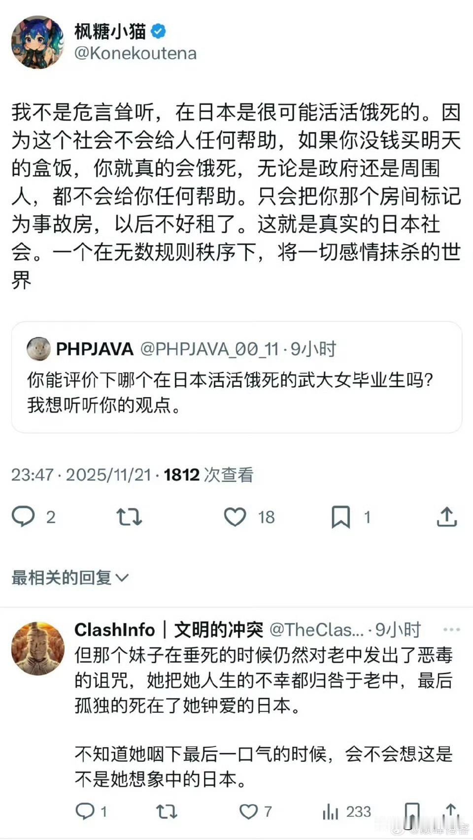 看到又有人出来夸日本的贫困托底,我第一时间想到的就是武汉大学女毕业生王懿,她是在日本东京活活饿死的,生前没有一个“朋友”伸出援手! 太可怜了!