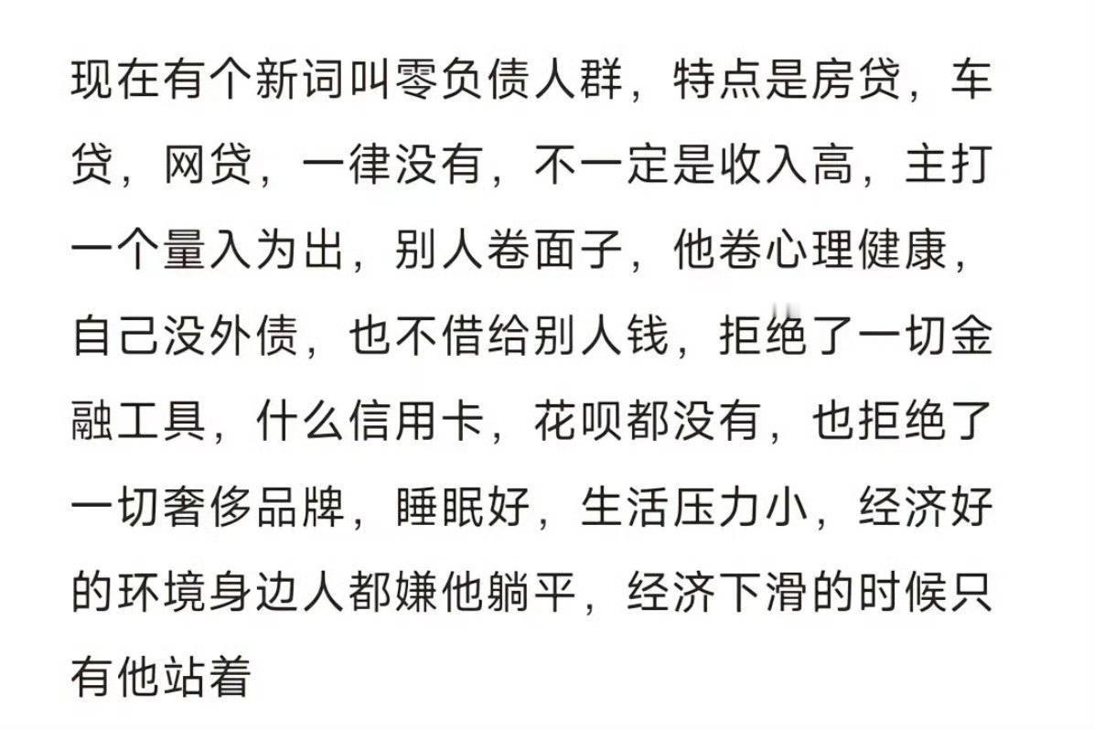 零负债人群的生活,简直不要太爽!他们不欠任何债务,生活那叫一个从容。就像我朋友,每月工资到手,先规划好各项开支,从不盲目消费。他不追求奢侈品,也不跟风贷款买房买车,日子简单又自在,完全不为数字焦虑。 这种自律让他们拥有了满满的安全感和自由。不过呢,也有人说他们可能会错失利用杠杆发展的机会。比如在房价上涨时,没贷款买房就少了资产增值的可能。但我觉得,每个人的选择不同,零负债的生活,也有它独特的魅力。
