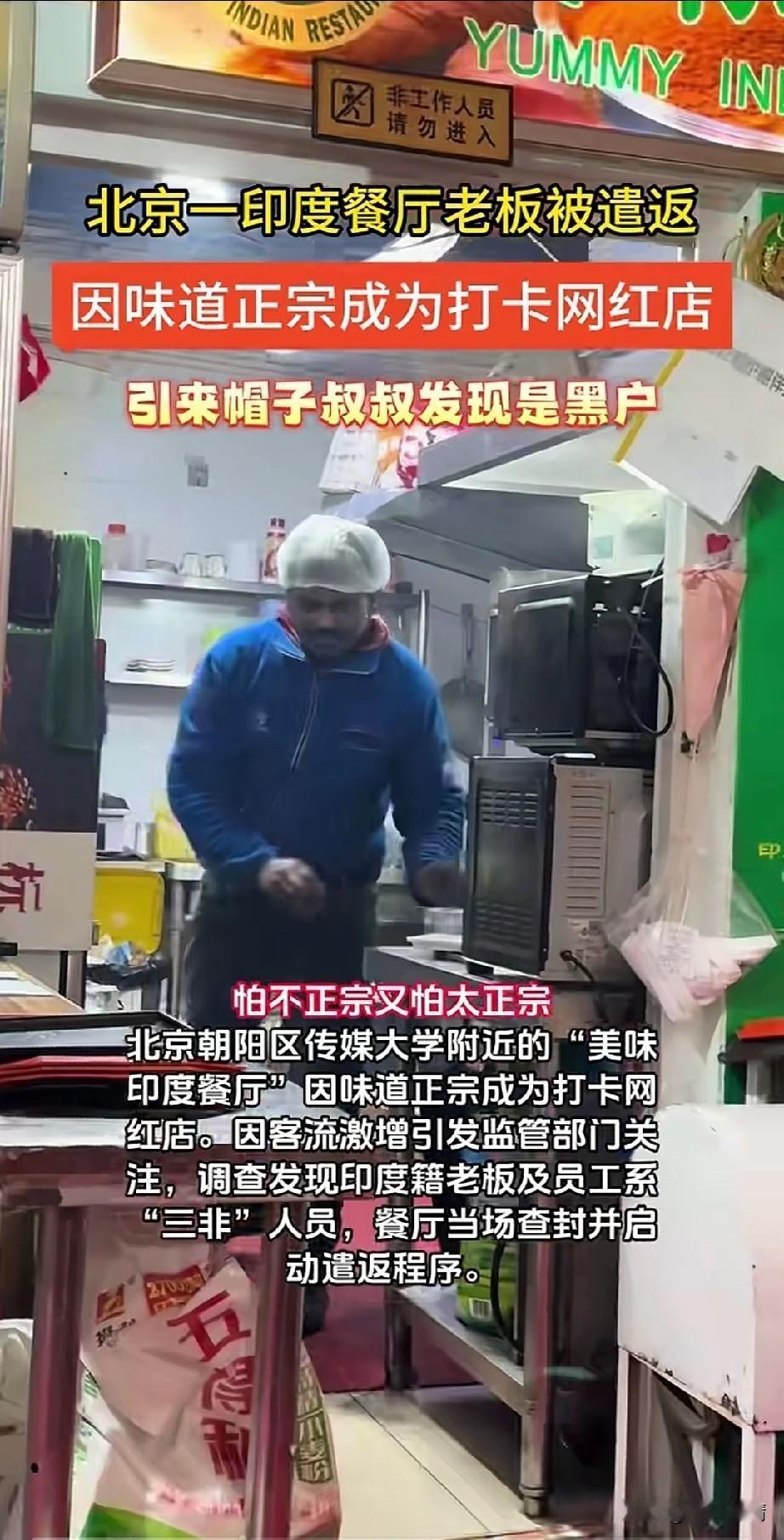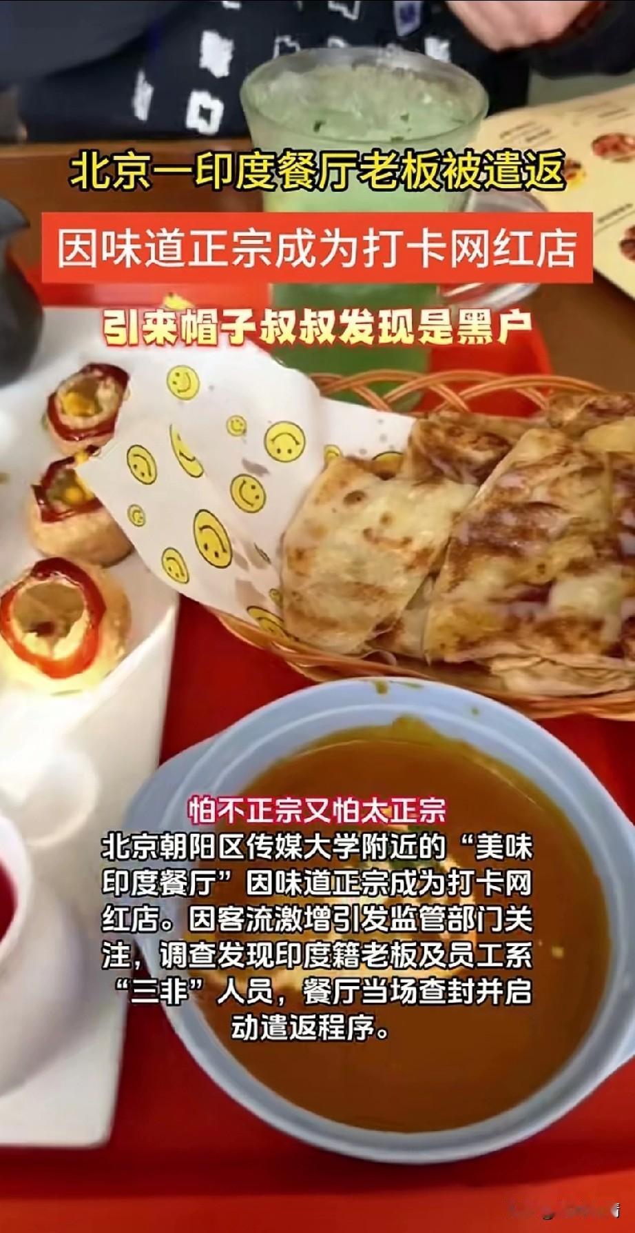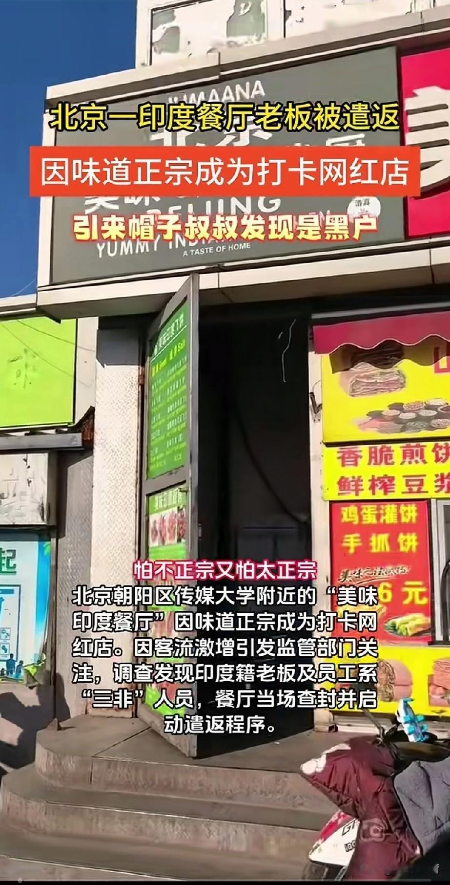 北京朝阳区传媒大学附近, 有一家美味印度餐厅, 有很多学生都来这里打卡, 餐厅的老板和员工都是正宗印度人, 他们黝黑的皮肤让人一看就确定是老外, 可能因为是异国美食, 这样餐厅的生意非常好, 来这里的食客害怕它不正宗, 但是又害怕它太正宗了, 由于客流量激增, 再加上它的名声越来越大, 引起了当地监管部门的注意, 一查发现老板和员工都是三非人员, 于是立刻将店铺查封, 并启动了遣返程序, 全国也有很多的印度餐厅, 他们的员工和老板都是印度人, 不知道他们的身份是否合法? 毕竟如今印度人大量激增, 我把中国当成了新的淘金圣地, 虽说文化需要交流, 但是三非人员就算了, 大家对于北京印度餐厅被查封怎么看? 印度中餐馆 深圳印度餐厅 印度网红餐厅 杭州印度餐厅 天都里印度餐厅 南京印度餐厅