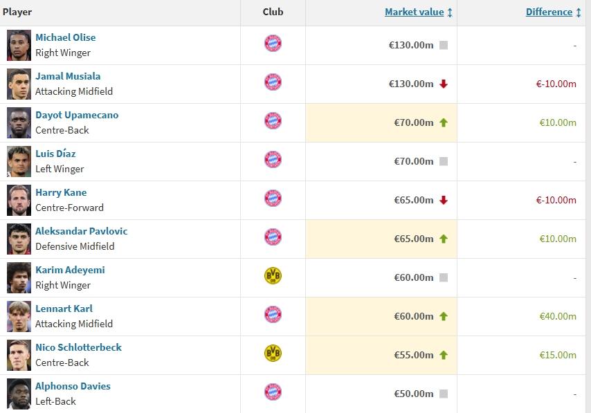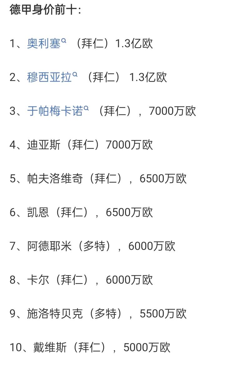 德甲身价前十:奥利塞、穆西亚拉两人均1.3亿并列第一 12月19日 今日德转更新德甲球员身价前十:,拜仁占八席,多特两席,奥利塞、穆西亚拉两人均1.3亿并列第一,于帕梅卡诺、迪亚斯均7000万欧并列第二,凯恩6500万欧第六