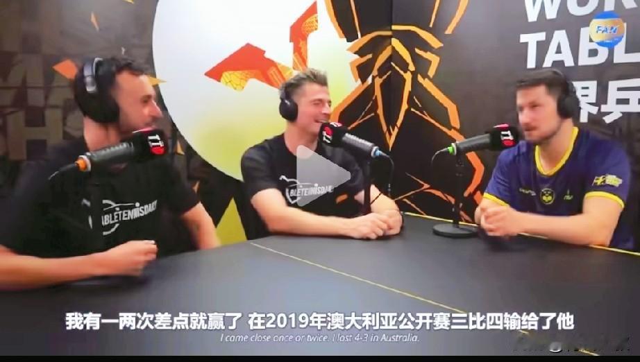 拉尔森对樊振东的描述简直太有画面感了! 主持人问: 你最喜欢看谁的比赛? 拉尔森说: 樊振东状态好的, 他打球简直是纯粹的艺术, 我会开一瓶香槟, 抱一桶爆米花, 静静的欣赏! 主持人又问: 那你和他打球什么感觉? 拉尔森:呃呃呃 三人哈哈大笑! 拉尔森接着说: 其实我有一两次差点赢他, 2019年澳大利亚公开赛, 我都2:0领先了, 没想到却3:2输掉了, 太折磨人了! 最尴尬的是, 拉尔森对输球, 记得这么清楚, 难道他不痛苦吗?