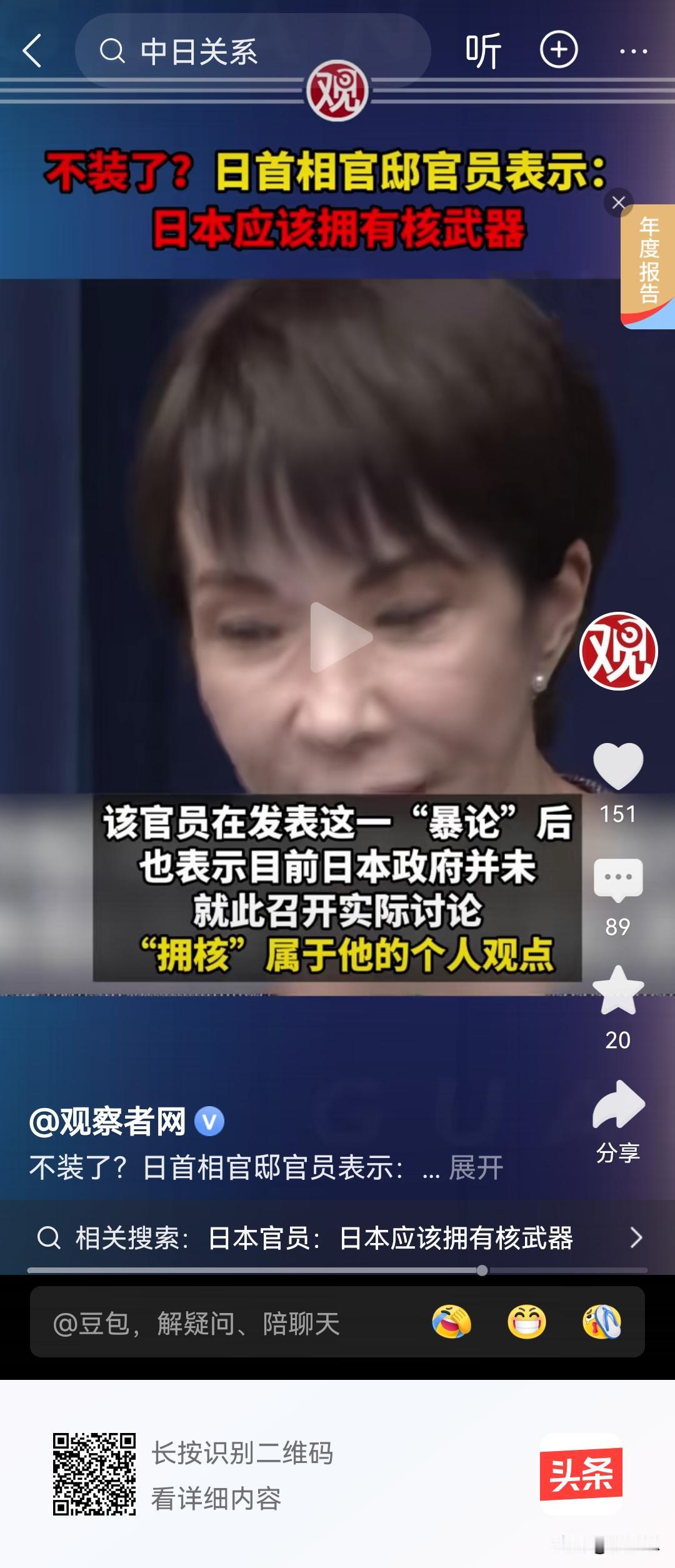 日本彻底不装了,日本政府首次表态应该拥有核武器,也就是说他们早就已经把核武器造出来了,是吧?之前我就发文表达过我的观点。日本为什么有核武器呢?日本在岛上这么多核电站,经常地震,这种真的是地震吗?不是地震。就是他们在海底里核试验造成的地震海啸,所以他们这种暗度陈仓的计谋。其实原子能机构应该也知道,就是原子能机构人员都被被日本收买了的,早就有人爆出来。所以要解决日本核武器问题,不要指望国际社会,中国和俄罗斯可以联合起来干。如果指望谁的话也不行,大不了中国自己先发制人。