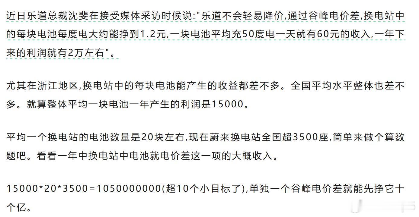 大家好,我是喜欢戳肺管子的新能源分析员。峰谷套利,是国内最普遍的电化学储能盈利模式,但你说一年能赚10亿,那我不得不计算一下。按照每日两充两放,每次价差1元(峰1.3谷0.3),按照储能系统充放电效率98%,电池效率96%。那么一块充到50度电的电池实际用电53度,实际放电47度,每日峰谷套利收益90.4元,一年差不多3.2万元。看起来非常可观是吧。但以上信息是在正常用电场所的情况,充/换电站并不是正常用电场所。蔚来高层原话:"通过谷峰电价差,换电站中的每块电池每度电大约能挣到1.2元,一块电池平均充50度电一天就有60元的收入,一年下来的利润就有2万左右"。那么,我们先来看一下主要区域峰谷价差。你会发现任何一个地方都没有两次价差超过1元。此时,精通计算的哥们就会说60元的收益还挺正常的,别忘了这句,充/换电站并不是正常用电场所。几乎所有的充换电站都配有专变,这个专变仅支撑充电场站的负载,说白了就是充/换电主机,它没办法良好执行削峰填谷这个策略。任何消费者都是逐利的,你说他们什么时候愿意来充/换电?自然是电费便宜的时候,也就是谷电。中国大部分省市的谷电都是22:00-次日8:00、12:00-14:00这两个时间段,这对换电站来说就造成了两个无法避免的BUG。1、踩着谷电开始这个点来的人,大概率享受到了平期甚至峰期时段充满电的电池。2、踩着谷电结束这个点来换电的,它换的电池必然是平期或峰期充电。一个没法完全跑开的策略,两个到处存在的BUG,这就意味着它部分峰谷套利节省的钱都被两个BUG抵消了。蔚来此前公布的数据显示,他们的换电站在国内平均日换电次数不到40次,我们就算它有35000块运行中的换电电池,相当于一个场站一天就流转那么几次,哪来的削峰填谷啊。最后,充电站的充放电效率和储能还真不一样,充电模块的效率平均下来只有95%左右,老站更低,充电效率和放电效率几乎是一样的,按照这个转化能力计算,充50度电需要从电网取电55度,能放出来45.6度电,以广州为例,假设运气好能跑两次峰谷套利,它确实可以赚60块,但别忘了,蔚来用的是三元锂,三元锂电池包的循环寿命有多少次?2500次吧。一天60,三年就循环完了,难不成我大蔚来一个投入300万的换电站,电池报废了也回不来本?
