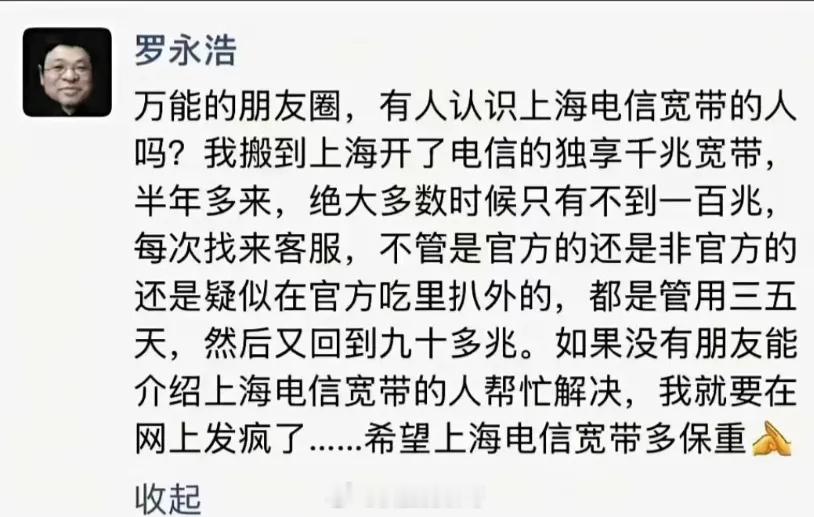 罗永浩痛批电信宽带缩水 不仅仅宽带有这种问题,我也遇到过运营商的网络有问题,根本就模糊处理,然后工作人员就说等扩容。看到罗永浩在朋友圈公开吐槽上海电信网速问题,这应该是全国都有这种现象......开通电信独享千兆宽带服务,宽带实际速率绝大多数时候仅有不到一百兆。