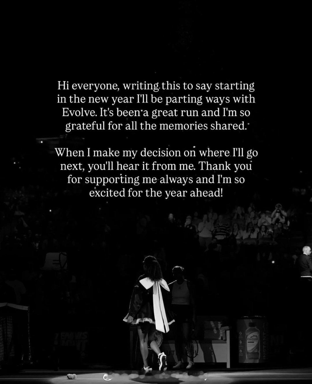 大坂直美离开创立的经纪公司 Evolve👋🏻“大家好,写下这段话是想告诉大家,新的一年开始后,我将与Evolve正式告别。这段旅程非常美好,超级感谢所有共同创造的回忆。关于接下来的去向,一旦我做出决定,你们会第一时间知道。感谢大家一直以来的支持,对即将到来的新年我充满期待!”网球talking大会 网球
