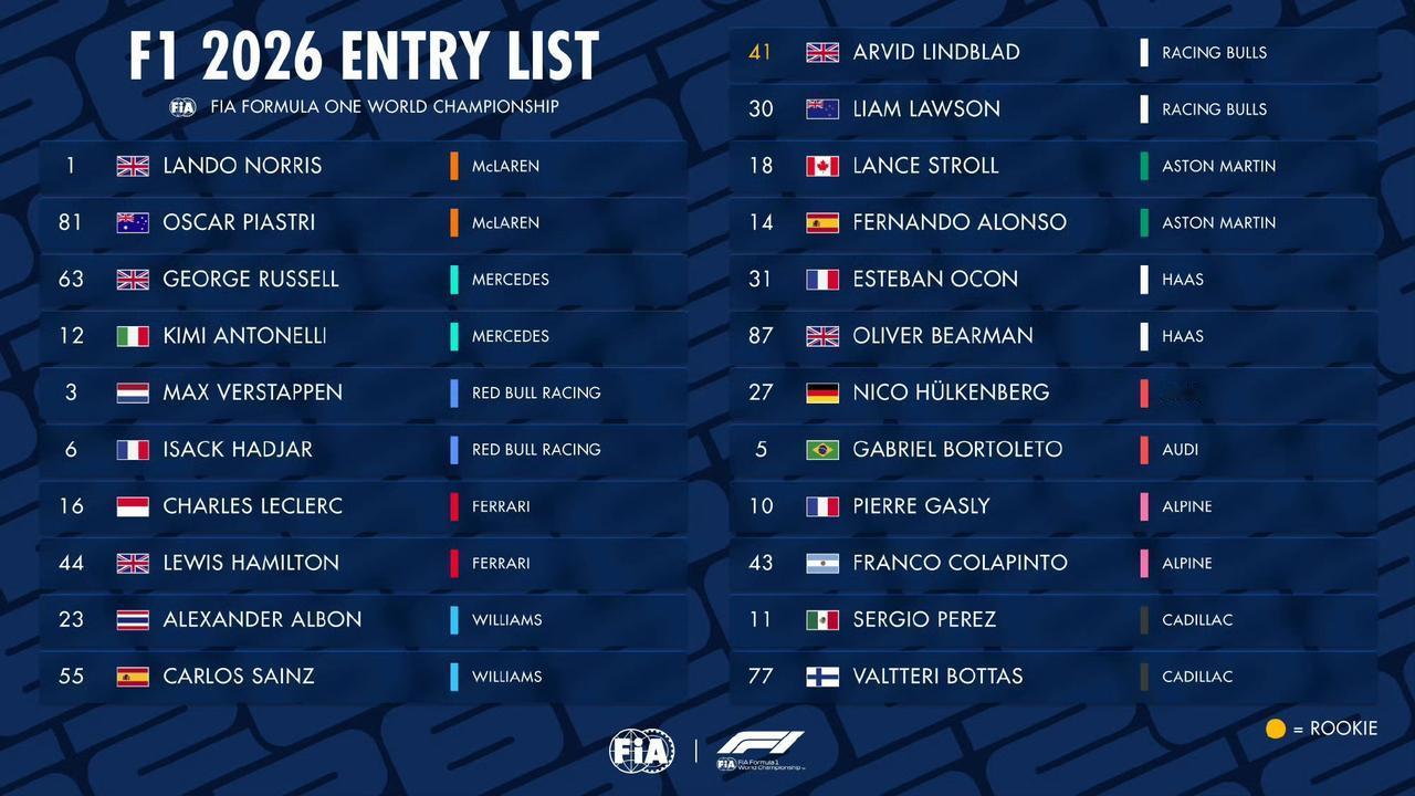 2026赛季F1正式车手的参赛名单以及各自的车号。 令人意外的是只有四个人选了1位数:1号诺里斯(1号是冠军专属号)、3号维斯塔潘、6号哈贾尔、5号博托莱托。 其他车手均是双位数,多达18人