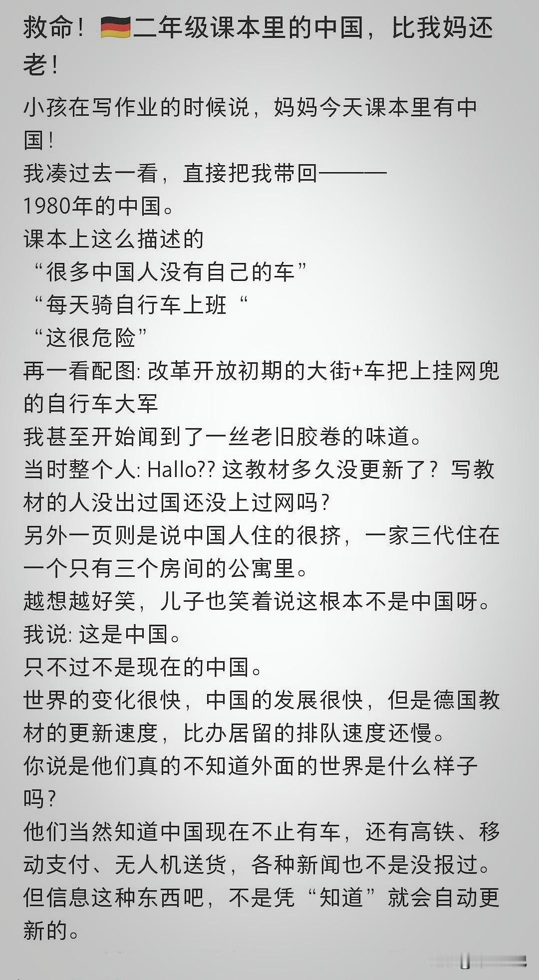 你敢相信吗?在2025年的德国二年级课本里,对中国的描述还停留在上世纪八十年代:没有私家车、出行都靠自行车、人人挤小公寓、耕田靠老牛。这画面和现实差得太远,简直就像两个世界。 实际上,中国的大街上早就跑满了汽车。高速公路和高铁里程已稳居世界第一。目前,全国机动车保有量已超4.3亿辆,其中汽车已超过3.3亿辆,平均每五人左右就拥有一辆。很多家庭不仅住进宽敞小区,农村也基本用上了机械耕种。 这些变化只要上网就能查到,但他们的教材竟然还如此滞后,这实在令人惊讶。真不敢相信这就是他们2025年给孩子们学习的教材,也真不知道这教材有多久没有更新了?就算写教材的人没出过国,他们还没上过网吗? 学生学到的是过时甚至扭曲的画面,这怎么能帮助他们理解真实的世界?教育本该打开窗口,而不是关上大门。