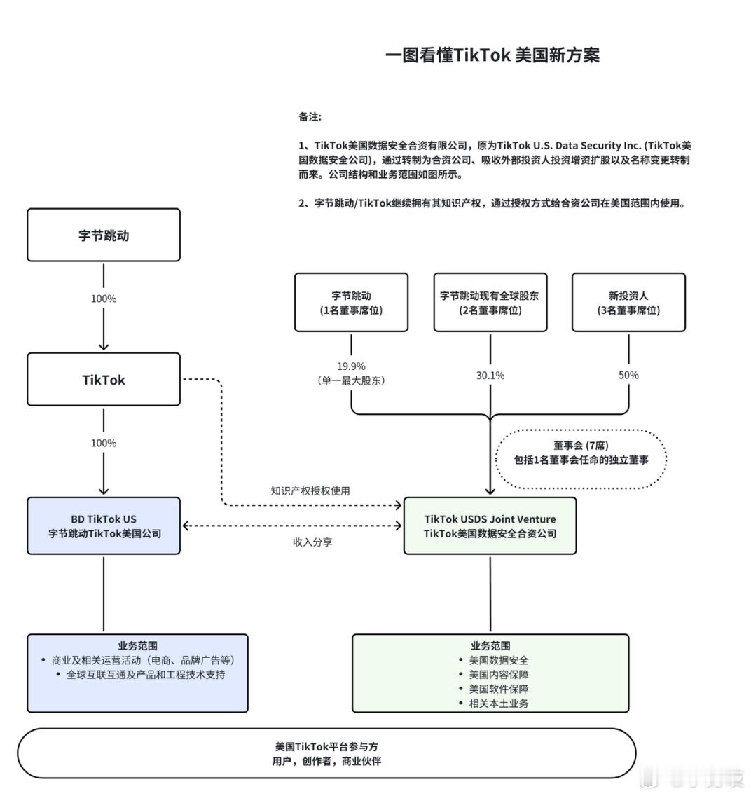 周受资内部信曝光:TikTok新合资公司负责数据安全,字节保留电商、广告业务!内部信曝TikTok美国方案在经历了漫长的拉锯战后,TikTok 在美国的命运似乎终于落下尾声。当地时间12月18日,TikTok CEO周受资发出内部信,更新了TikTok美国业务进展。内部信称字节跳动、TikTok已与三家投资者签署协议,并将成立新的TikTok美国合资公司。新合资公司名为TikTok美国数据安全合资有限责任公司( TikTok USDS Joint Venture LLC),将负责美国的数据保护、算法安全、内容审核和软件保障。由字节跳动全资控股的、TikTok在美国的其他实体将继续负责电商、广告、市场运营等商业活动,以及TikTok产品的全球互联互通。据悉,协议相关事宜将在不晚于2026年1月22日完成。如果一切顺利,1.7亿美国用户将继续在TikTok上刷视频、搞创作,广告主们也将继续连接全球。而对于字节跳动来说,这不仅是保住了一块核心市场,更是在规则丛林中,完成了一次极其复杂的商业战略防御!