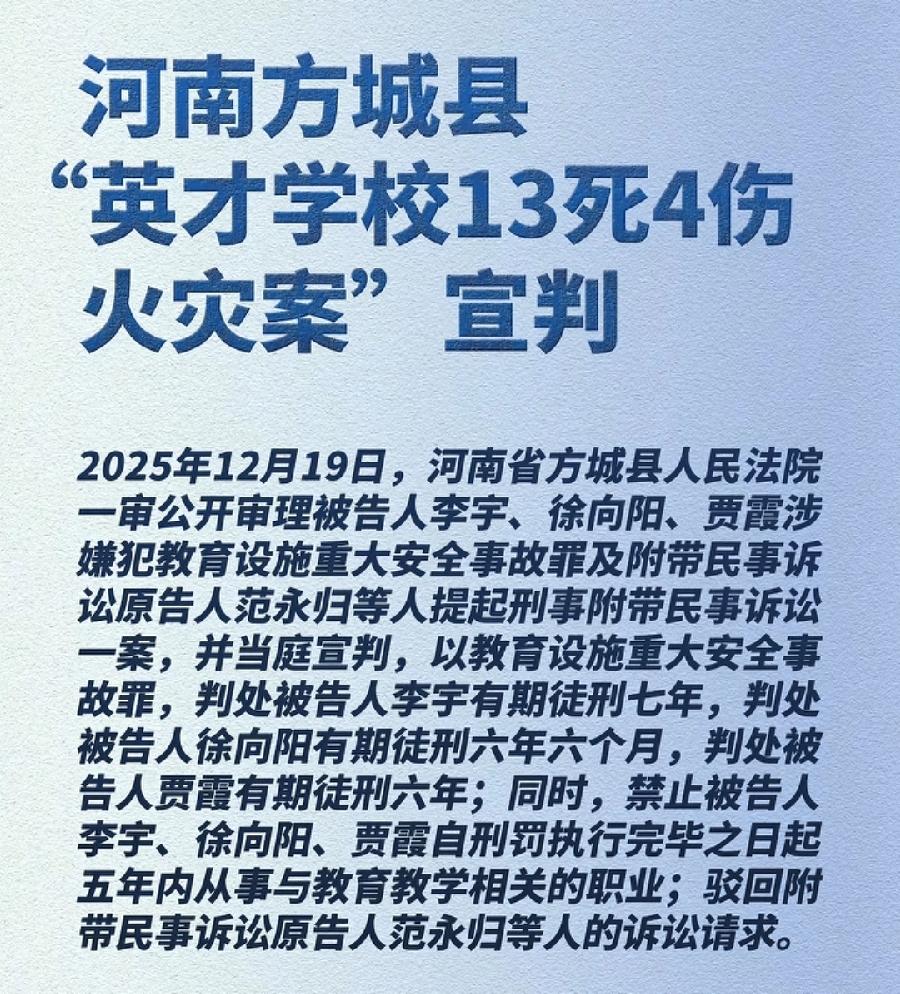 方城火灾案宣判,学校3人被判刑: 1、李某,创办人,7年,55岁 2、徐某阳,校长,6年6个月,53岁 3、贾某,班主任、宿管员,6年,58岁 教育设施安全事故罪,属于过失罪,最高才7年,可见基本都是顶格判了,三人被抓也近2年了,所以最多再坐牢5年,时间也不长,三人当庭表示认罪,这么严重事故,肯定也非常心怀愧疚,徐某阳与贾某在现场还流泪了!都是为人父母的,怎能不感同身受!案件基本告一段落!