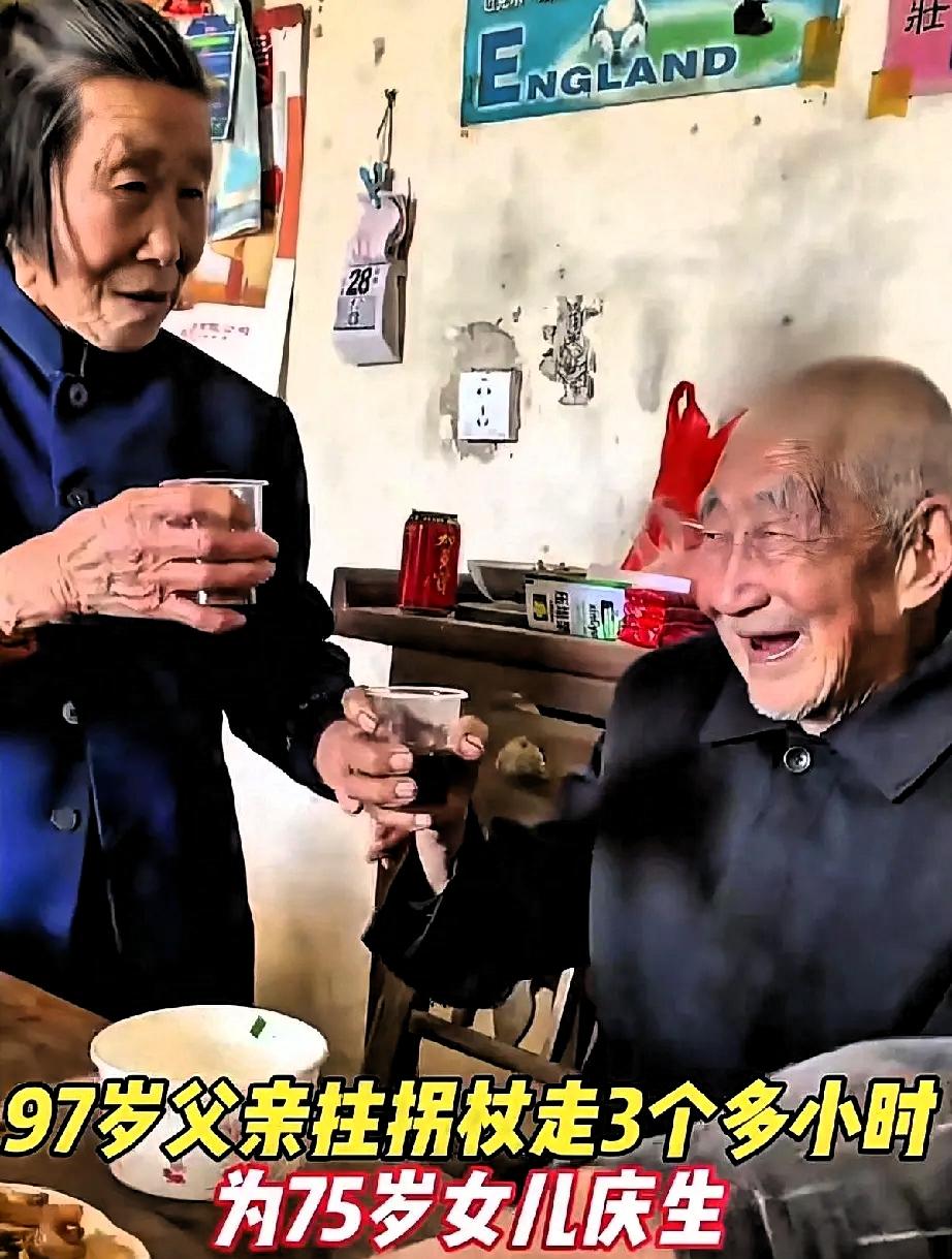 我的天爷!湖北,75岁老人过生日,饭菜刚上桌,院门吱呀一响,她抬头一看,惊得筷子啪地掉桌上:“我的爹诶!你咋来啦!” 门口站着的是97岁的老父亲,他拄着拐棍,呼哧呼哧喘着粗气,脸上却满是笑意:“给俺闺女生日个惊喜!”没人想到,为了这份心意,老爷子硬是徒步走了十几里路,花了三个多小时才到。 闺女又心疼又气,嘴上不停埋怨“咋不提前吱声”,手上却麻利地搀着父亲进屋,忙着倒热水、擦汗水,还特意挪到离父亲最近的座位守着。 饭桌上摆满红烧肉、炖排骨,她捧着酒杯凑过去,柔声叮嘱父亲少喝点解解馋,又夹了块炖得软烂的肉放进父亲碗里。这一刻,她不再是家里主事的长辈,反倒像个被宠着的小丫头。 饭后闲聊,她给孙辈们讲起往事:过去日子穷,父亲冒着风险偷红薯给她解馋,蹲在炕边一夜没合眼;家里唯一的窝窝头,父亲捂在怀里带回家塞给她,自己靠喝凉水压饿;村里小子欺负她,父亲攥着拳头找上门,非要对方把毽子捡回来。 老爷子坐在一旁,笑着摆手:“那时候穷啊,就想让俺闺女多吃口、少受委屈。”说着又拍了拍闺女的手背,满眼都是疼惜。一旁的重孙踮着脚尖,用小手给太爷爷擦汗,奶声奶气地说下次要用小车接他。 这一幕看得人心里热乎乎的。我们总习惯用红包、快递代替陪伴,却忘了老一辈的爱从不是甜言蜜语,而是藏在“我亲自来”的行动里。不管多大年纪,有爹疼的人永远有靠山,不用硬撑着坚强。75岁还有爹可撒娇,这才是人世间最踏实的福气。