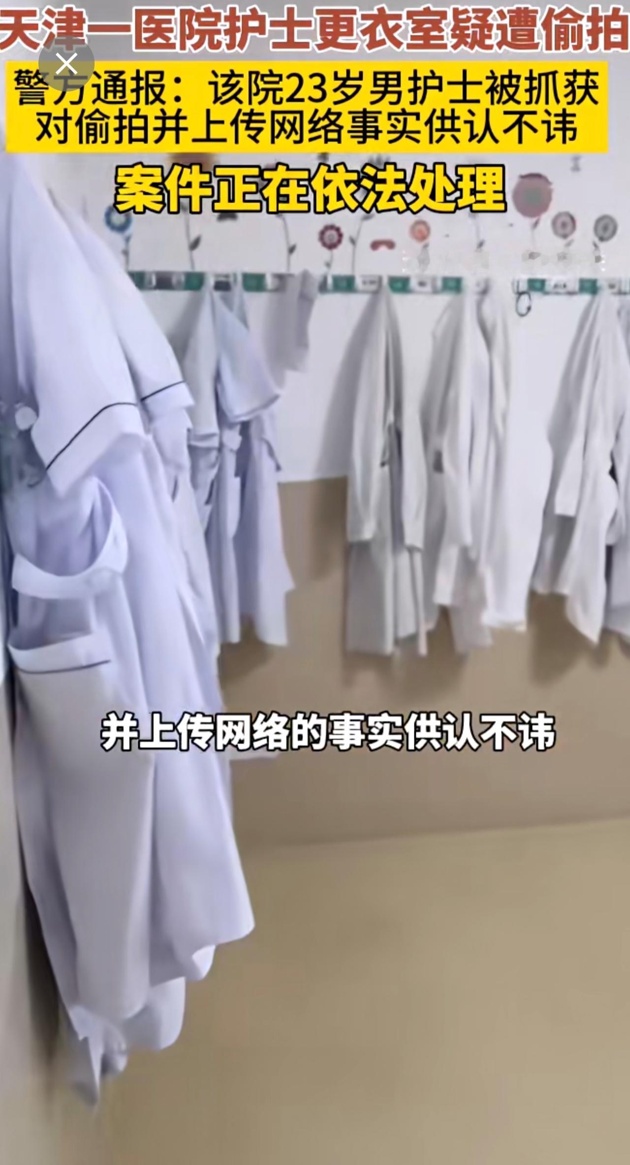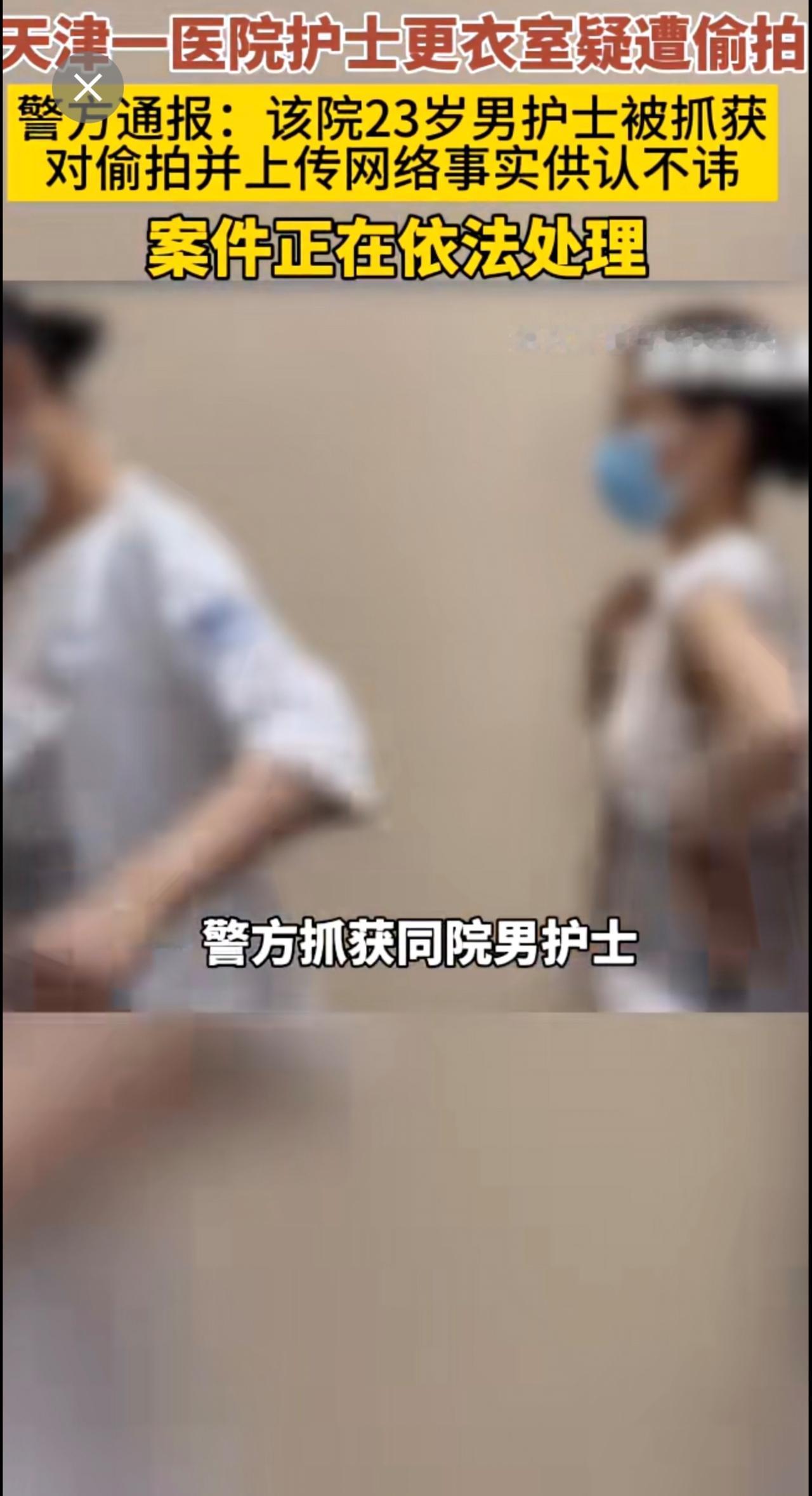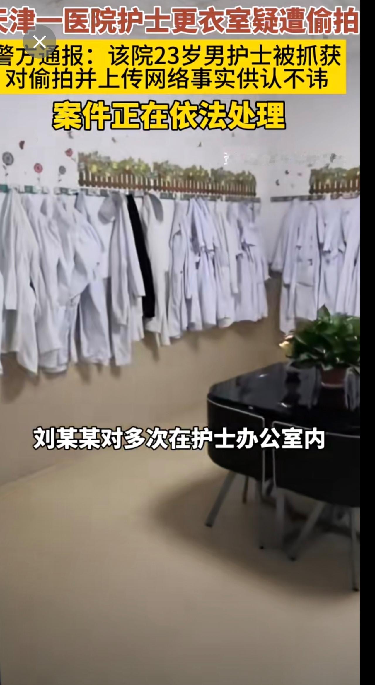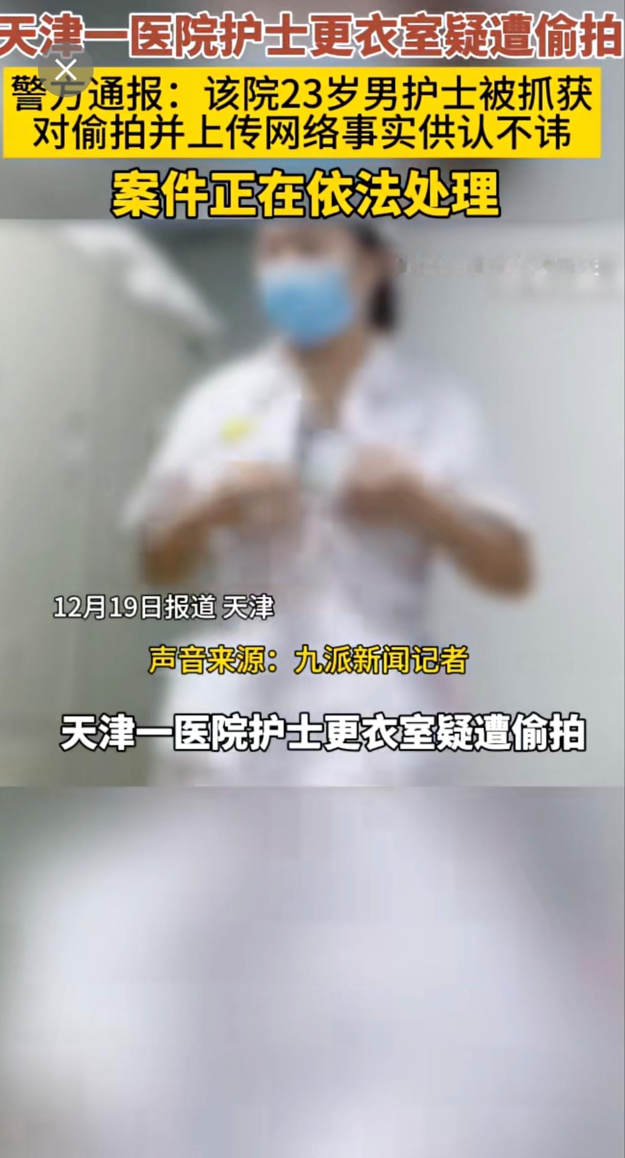 12月19日报道,天津一医院女护士被多次偷拍,警方通报:该医院23岁男护士刘某某被抓,刘某某多次在办公室偷拍并上传网络。(九派新闻)