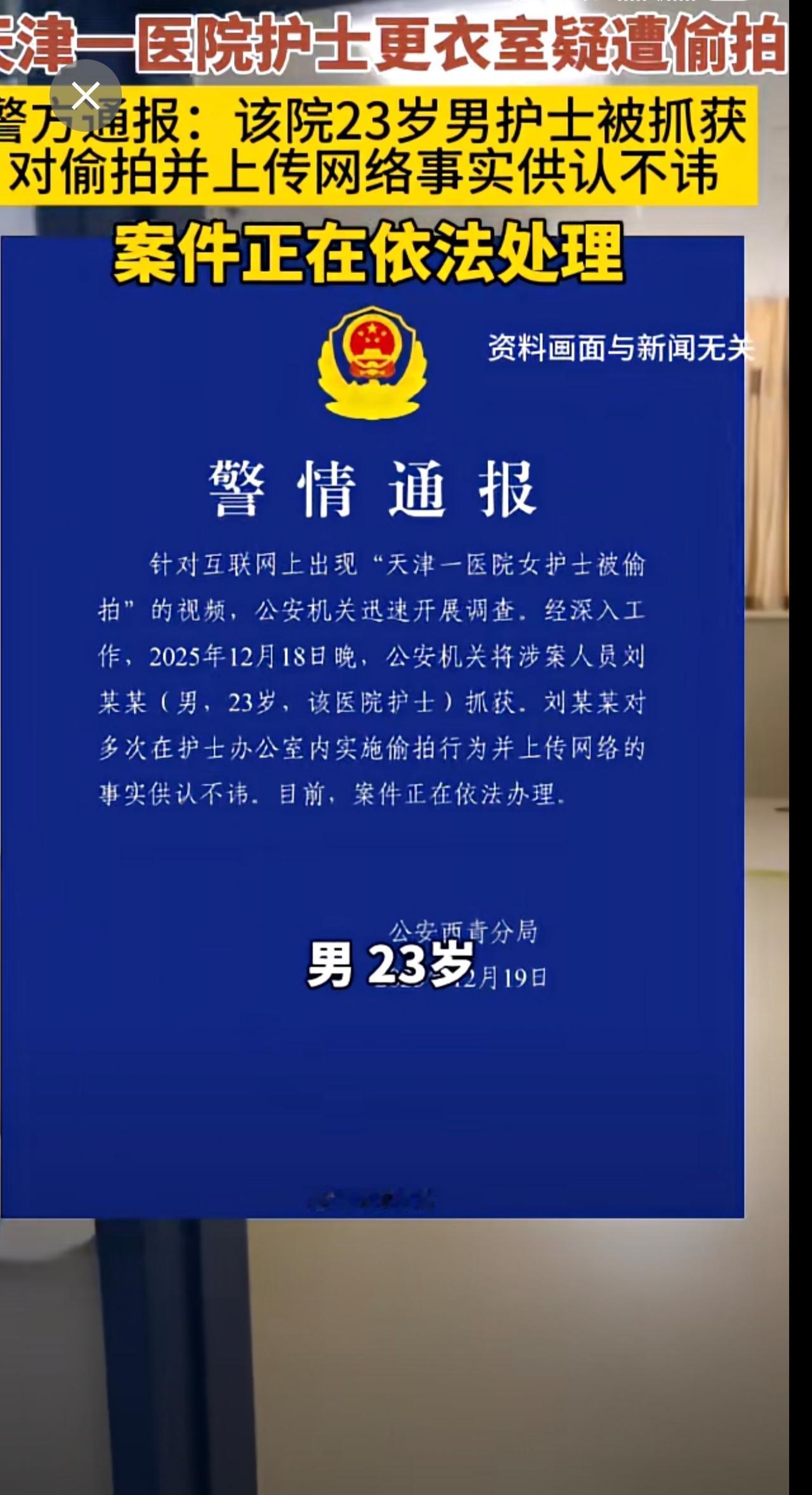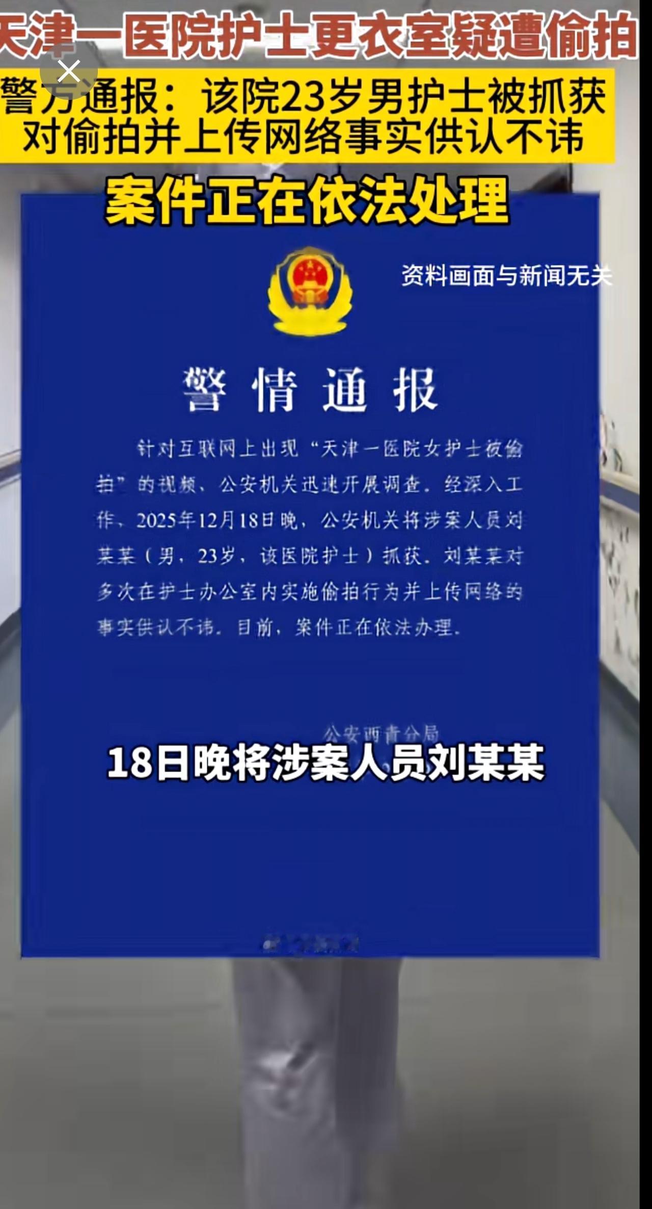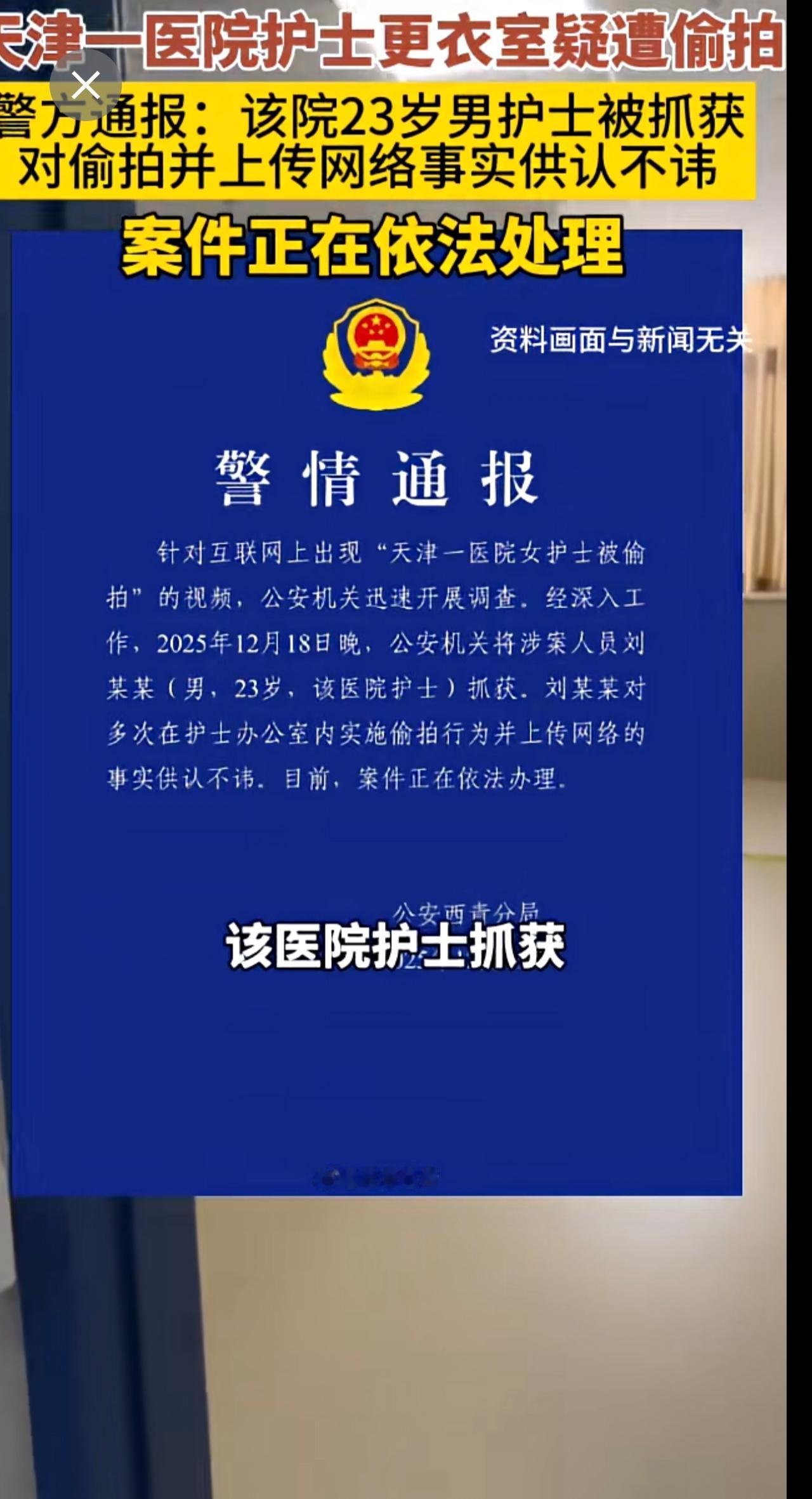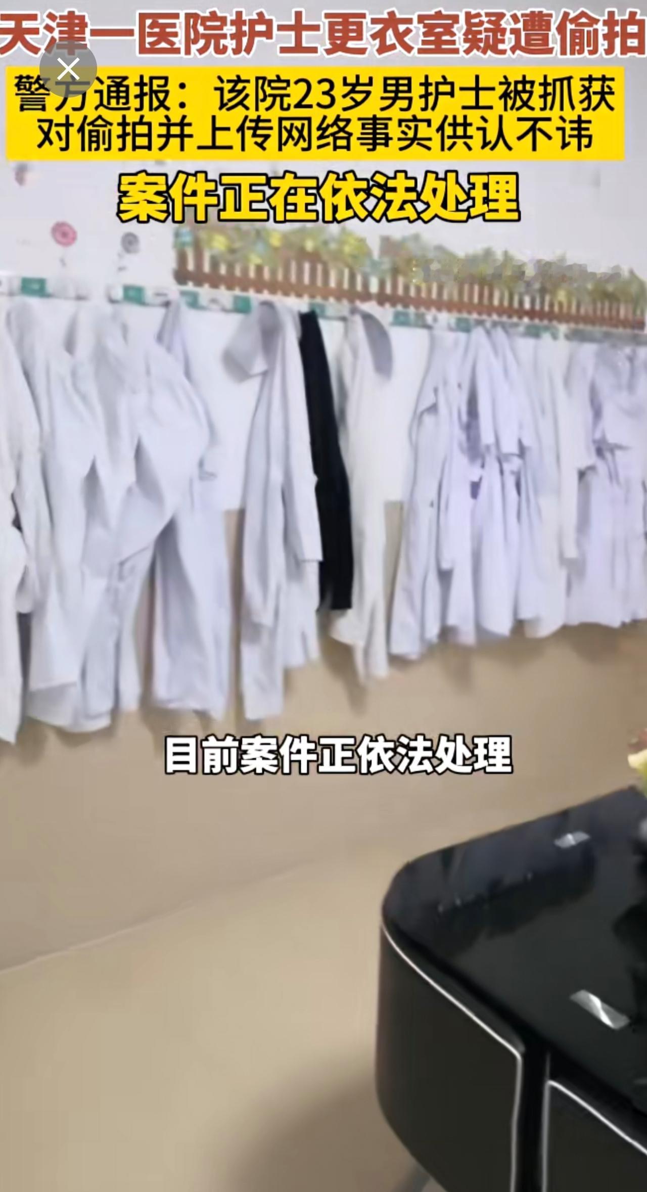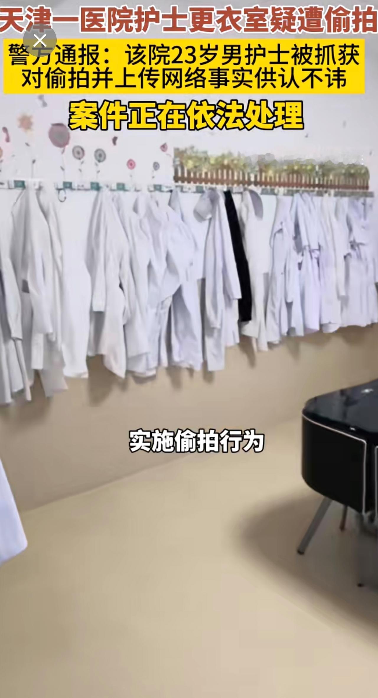 12月19日报道,天津一医院女护士被多次偷拍,警方通报:该医院23岁男护士刘某某被抓,刘某某多次在办公室偷拍并上传网络。(九派新闻)