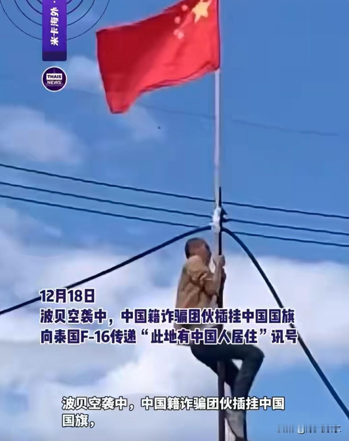 12月18日泰国中文社报道,波贝空袭时,中国诈骗团伙插国旗向F-16喊话“有中国人”,想借此保命。 网友怒骂:“平时坑同胞,遇险就挂旗,给我使劲炸!” 诈骗犯自私无耻,把国旗当“护身符”,妄想用国家象征逃避制裁,玷污国旗尊严,让无辜国人可能被牵连,激化民愤。 国籍不是违法挡箭牌!诈骗害同胞,遇险还想蹭保护,必须严惩。 国旗是尊严,不是败类的“免死牌”!对这种坑自己人、辱国家的货色,零容忍——守护荣誉,先铲除蛀虫!